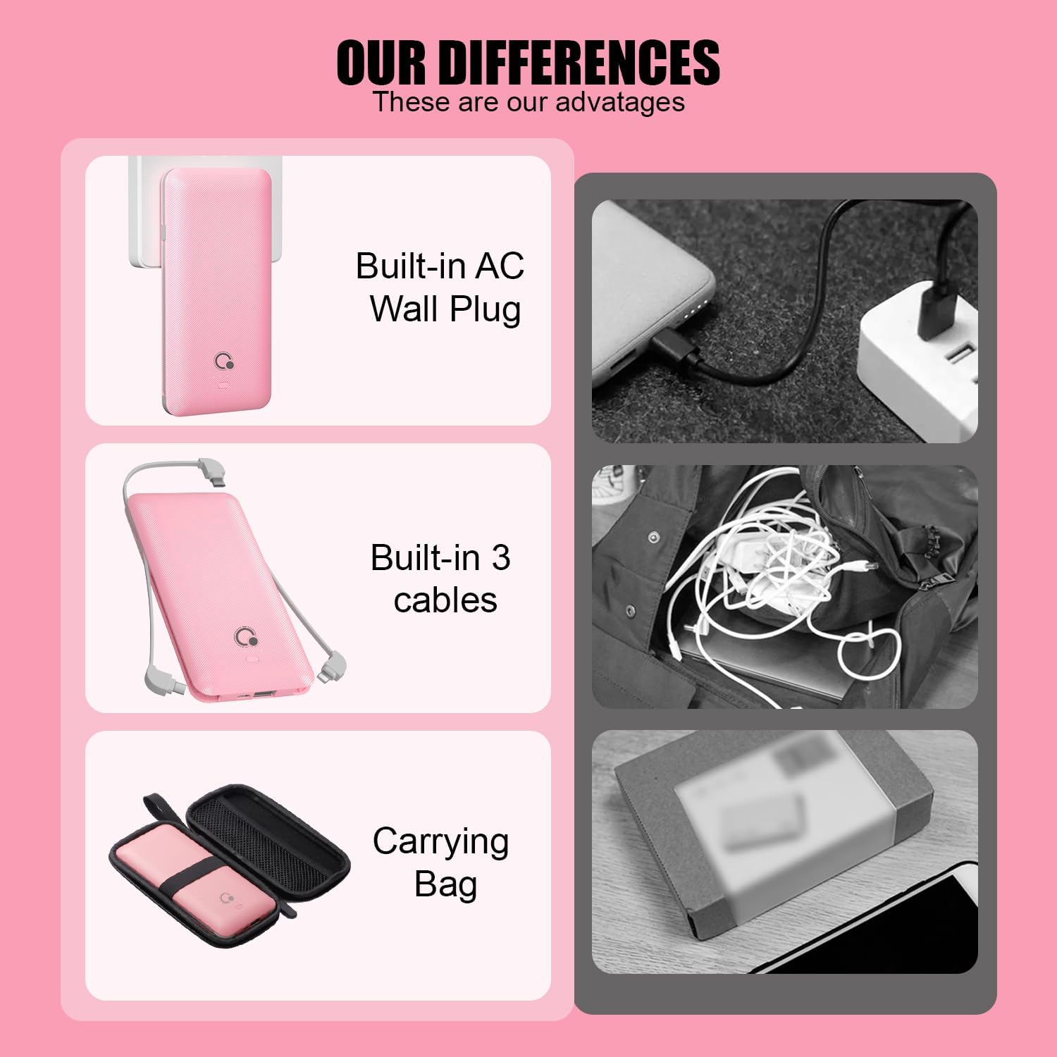 - [Slim and Compact Size Portable Charger]:Q External battery pack which make it easier to carry, built-in AC wall plug and cables are collapsible, will not give you too much trouble when carrying out