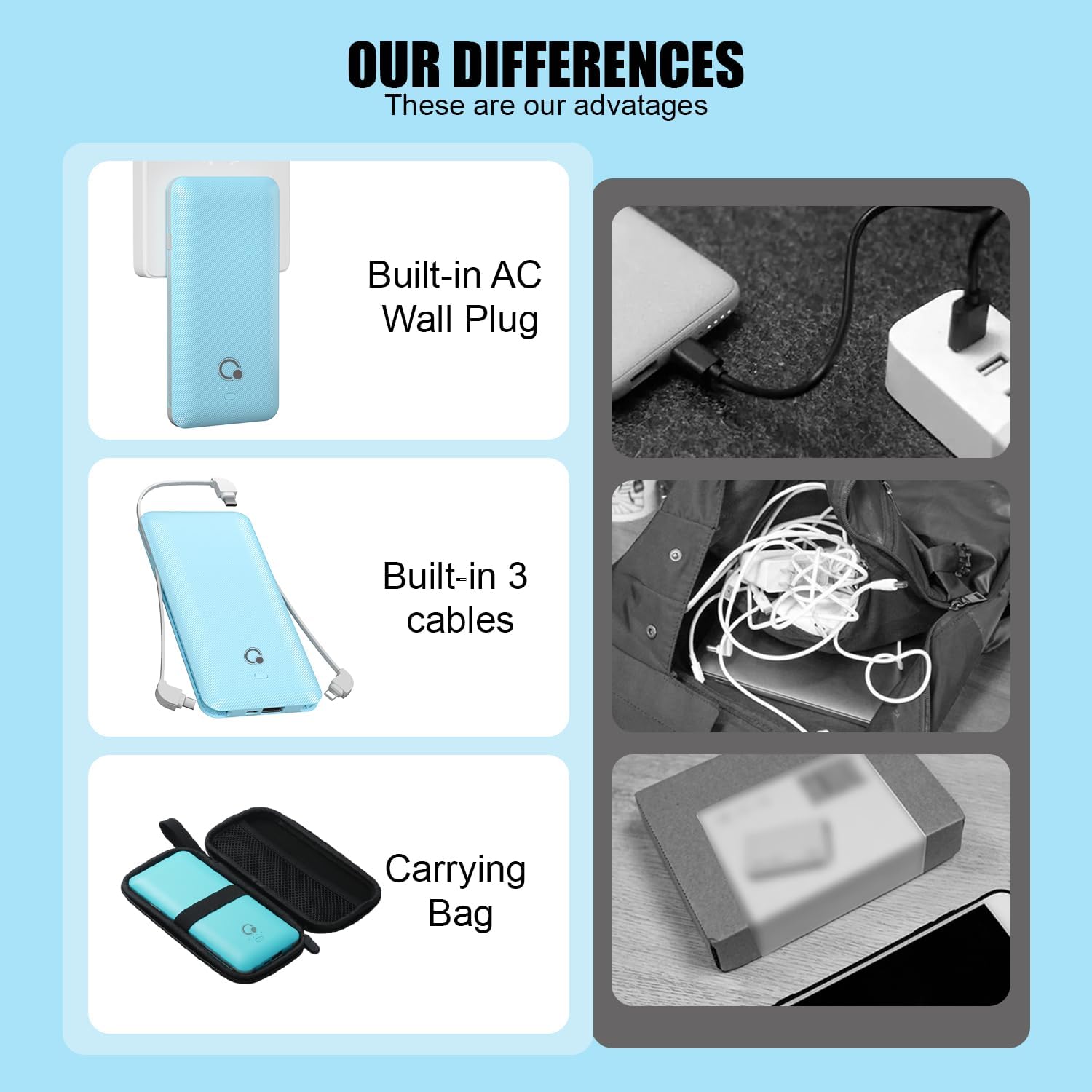 - [Slim and Compact Size Portable Charger]:Q External battery pack which make it easier to carry, built-in AC wall plug and cables are collapsible, will not give you too much trouble when carrying out