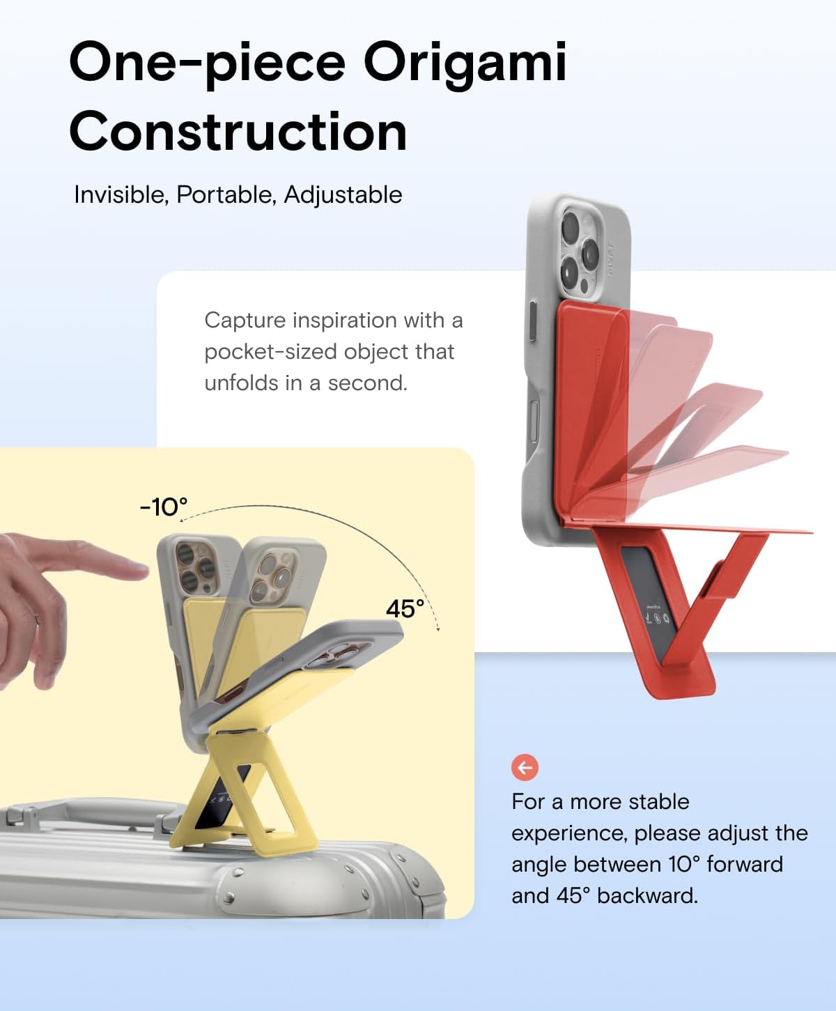 - Quick Setup & Ultra-Portable: Inspired by origami, this foldable phone tripod transforms from a slim card into a full phone tripod in seconds—no screws, loose parts, or assembly needed! At just 3oz, it’s the most compact and travel-friendly phone stand, easily carried in your bag or attached to a MagSafe case. Perfect for content creation and hands-free viewing: ideal for Self-vlogging, group vlogging, outdoor photography, video calls, browsing, online classes, or fitness.