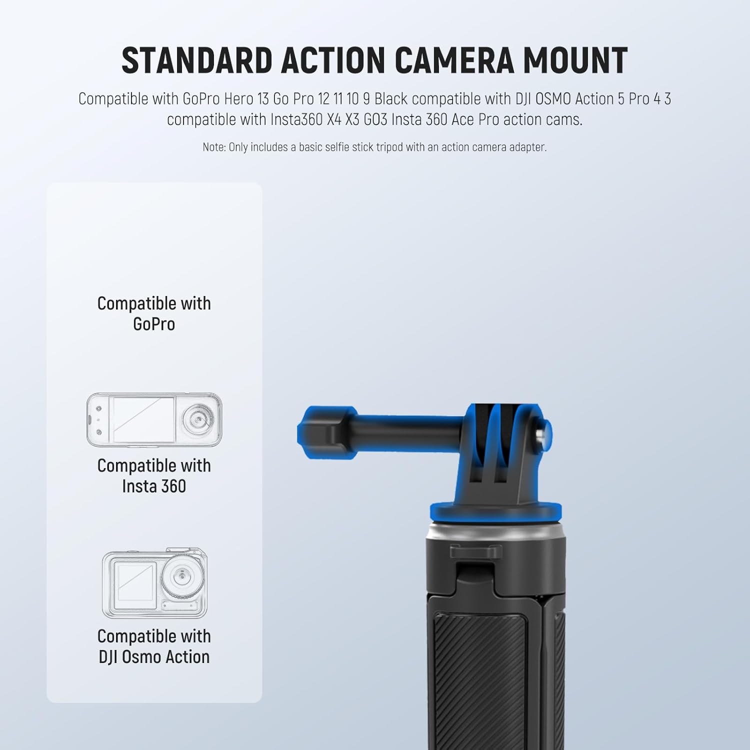 - 【Tripod Stand for Action Camera】 Mount the action camera adapter via the top 1/4" screw, compatible with GoPro Hero 13 Go Pro 12 11 10 9 Black compatible with DJI OSMO Action 5 Pro 4 3 compatible with Insta360 X4 X3 GO3 Insta 360 Ace Pro action cams compatible with DJI Osmo Pocket 3 handle, etc. You can also attach a phone holder or other photography and videography accessories, gears, or equipment like a monitor, fill light, or microphone (all not included) for versatile use