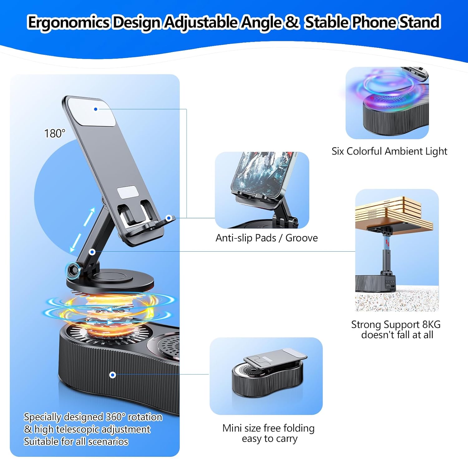 - 【360° Adjustable Viewing Angle & STABLE STAND】Featuring an ergonomic 360° rotating mechanism that supports optimal screen positioning for video calls, gaming, or movie nights. The triple anti-slip protection system-reinforced base, textured backplate, and silicone-grooved cradle-guarantees secure placement of smartphones (4-13"), tablets, and e-readers, even during intense usage