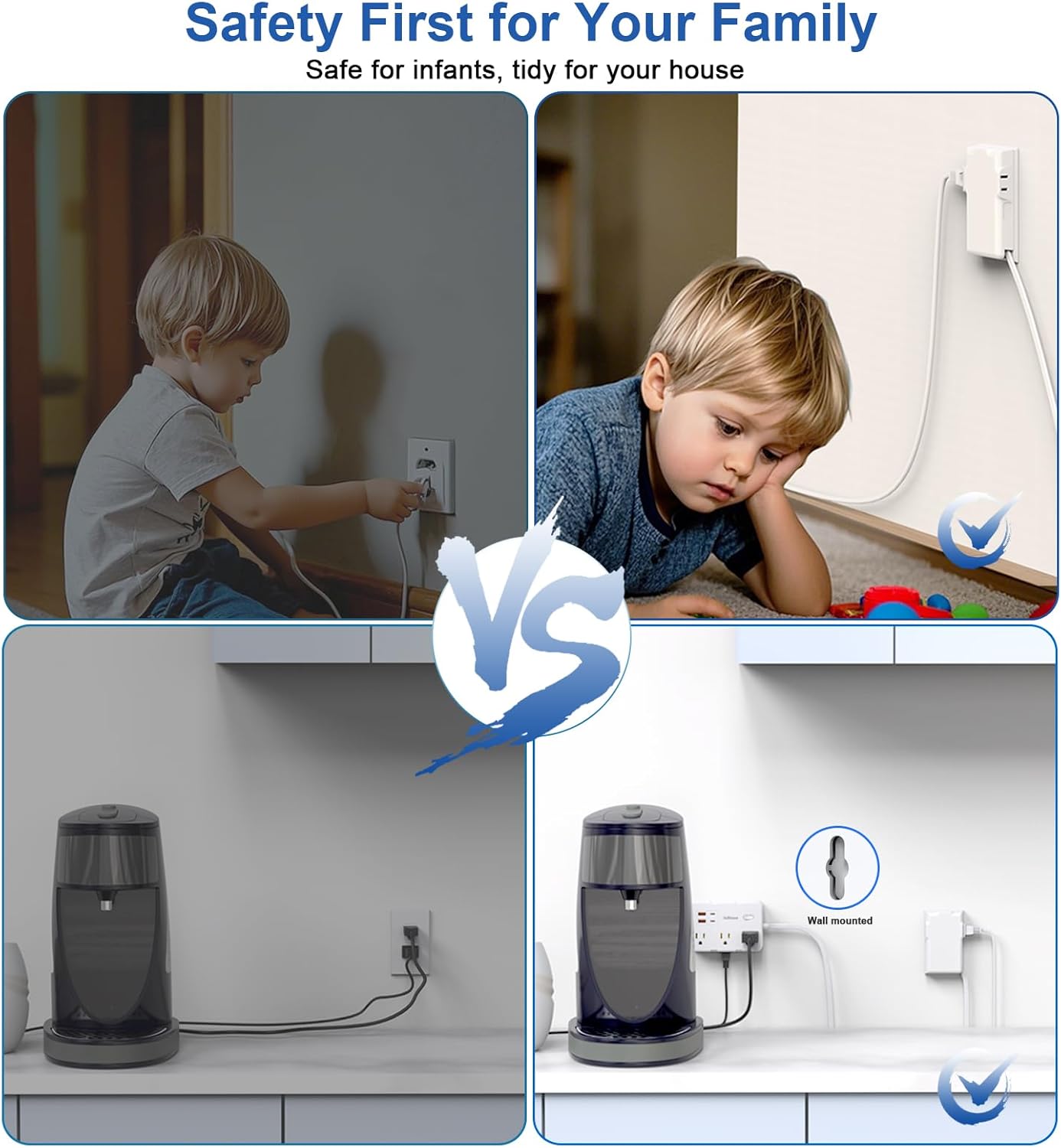 - COMPACT DESIGN: Space-saving white housing with organized layout keeps cables tidy and maximizes outlet accessibility. Desk Charging Station & Wall Mountable Design-This mount power strip can be fixed on the wall or desk by 2 keyhole slots on the back, allow this wall mount power strip to be installed in various applications. With 4 anti-slip rubbers bottom, the power strip can be stable on your desktop or nightstand without slipping off.