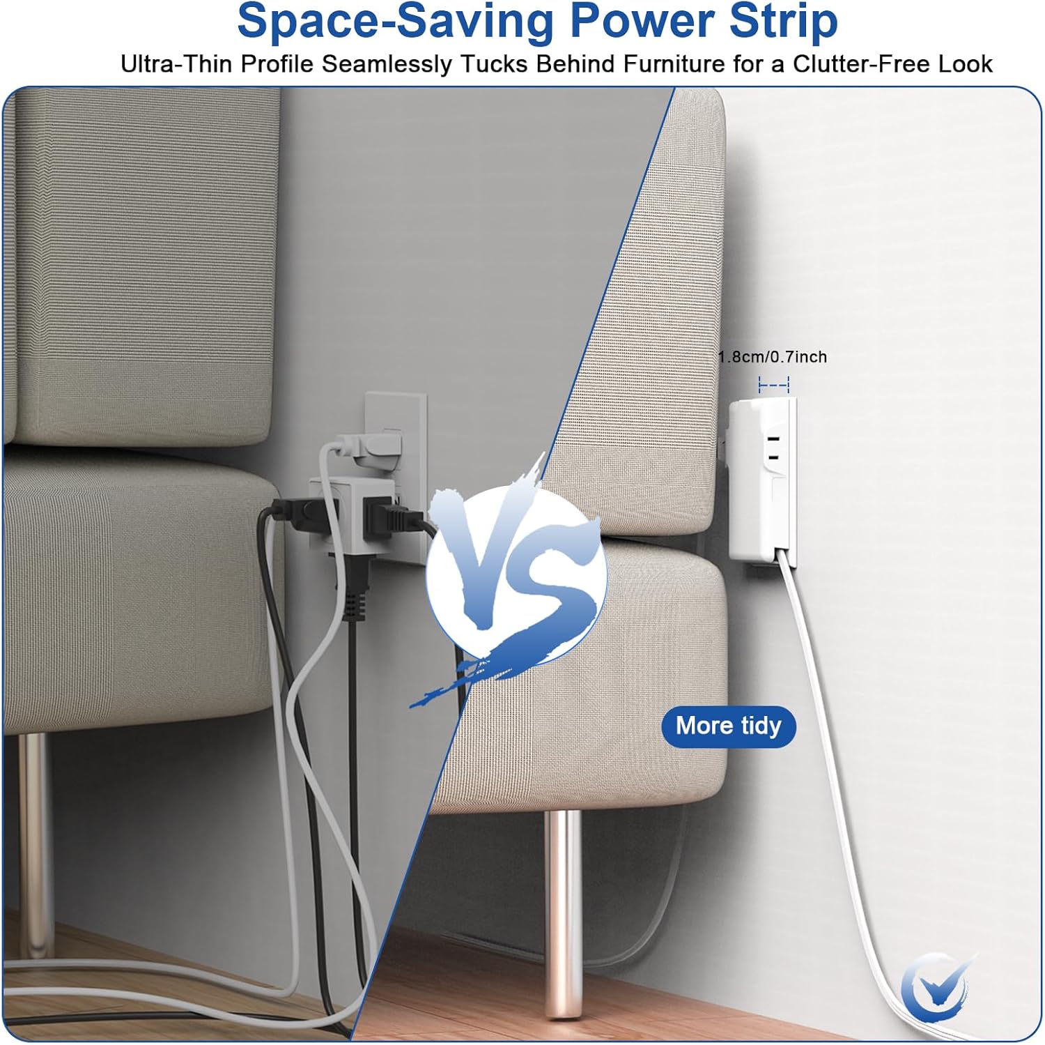 - SURGE PROTECTION: Built-in surge protector safeguards your devices from power spikes and fluctuations.5 Ft Flat Extension Cord Ultra Thin Flat Plug - with only 0.35 inch ultra slim design, the wall flat plug is thinner than traditional plugs, which can close to the wall easily, fits tight spaces behind sofa, nightstand, bookshelf and headboard. The 45° right angle flat plug design keeps anther outlet free, and the 5ft low profile flat extension cord makes it tangle-free and more flexible.