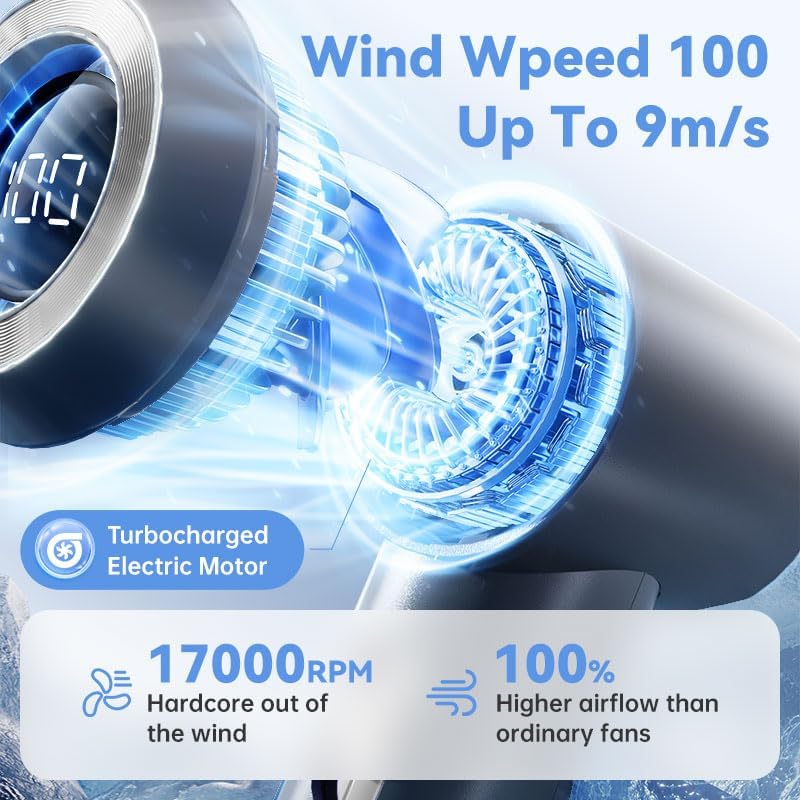 - Mini turbo jet fan: It features a 100 Level high-speed, powerful 9 m/s airflow, powered by a 3-phase brushless electric motor running at 17,000 RPM, delivering fast and strong performance. With adjustable speed (1-100 levels) and a bladeless design, it ensures safety for kids and teens.