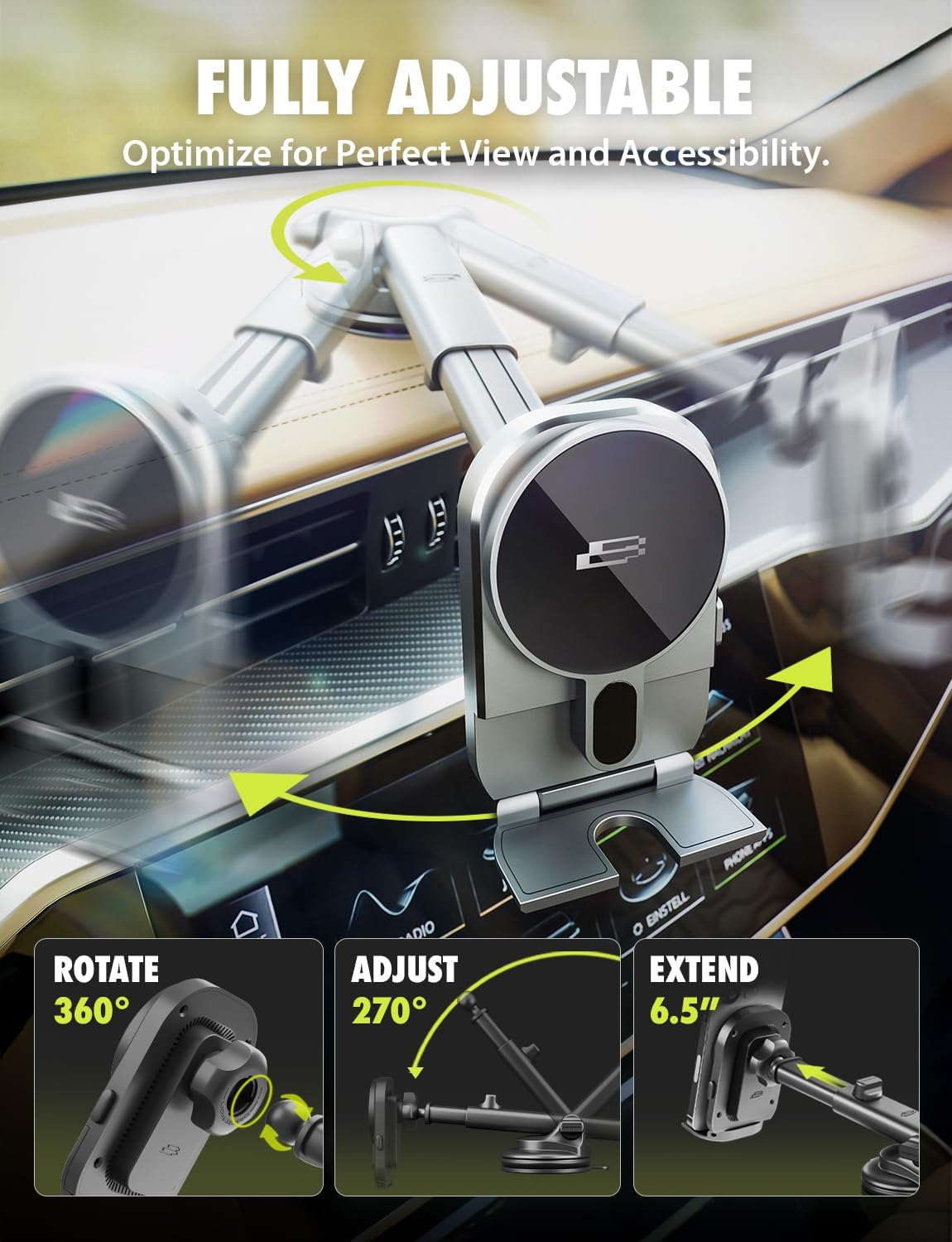 - 【Expert Holder fit for MagSafe】:Our PwrUp MagAlign Series Extend Magsafe Car Mount Charger with Non-blocking/Mag safe Function is designed to create the perfect mood for every drivers' experience. Our adjustable Telescopic Arm of magsafe car mount extends up to 6.7 inches. With extension arm and free angle adjustment , they can create a comfortable ambience, or a vivid, bright and refreshing driving atmosphere - which suits your car best.