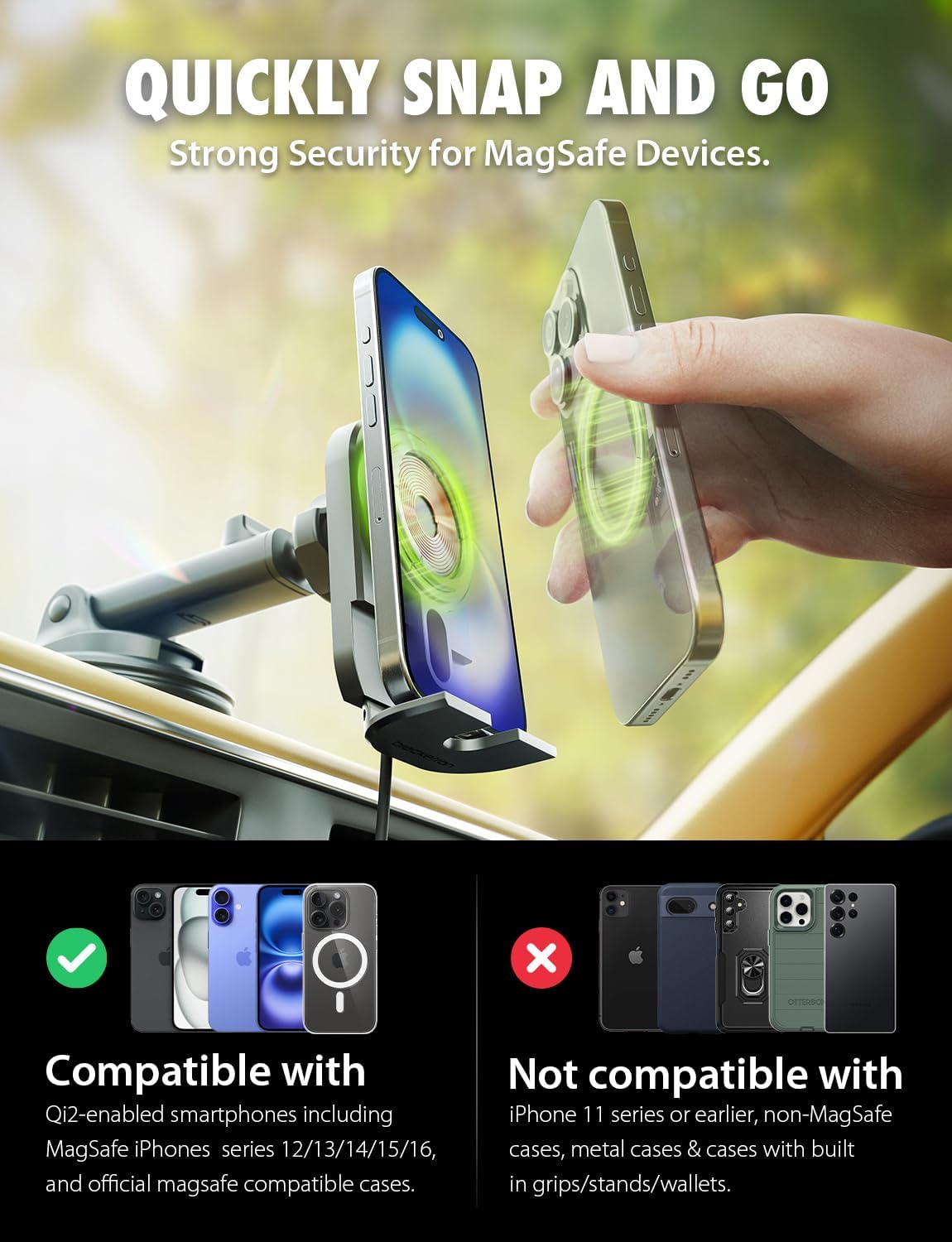 - 【Strong Magnetic MagSafe Car Mount 】:This powerful magsafe car phone mount can create a powerful N52 magnets attraction that firmly supports your device while allowing you to drive without distraction. The wireless car charger easily and securely holds your phone through bumps, sharp turns or even sudden stops, no worrying of dropping your phone.