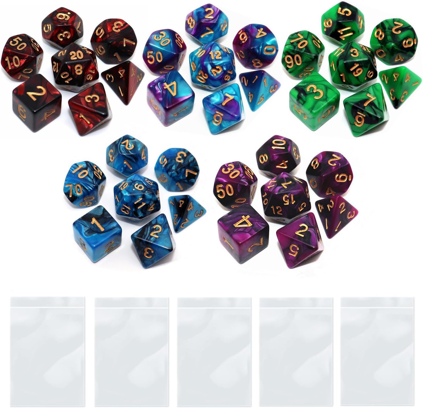 - 🎲Easy to Collect and Carry: Set of 5 pack 35 pcs dices, including D20 D12 D10 D% D8 D6 D4, each dice set equipped with a dice bag, convenient for you to store and carry these dices anywhere you like, no need to worry about losing.
