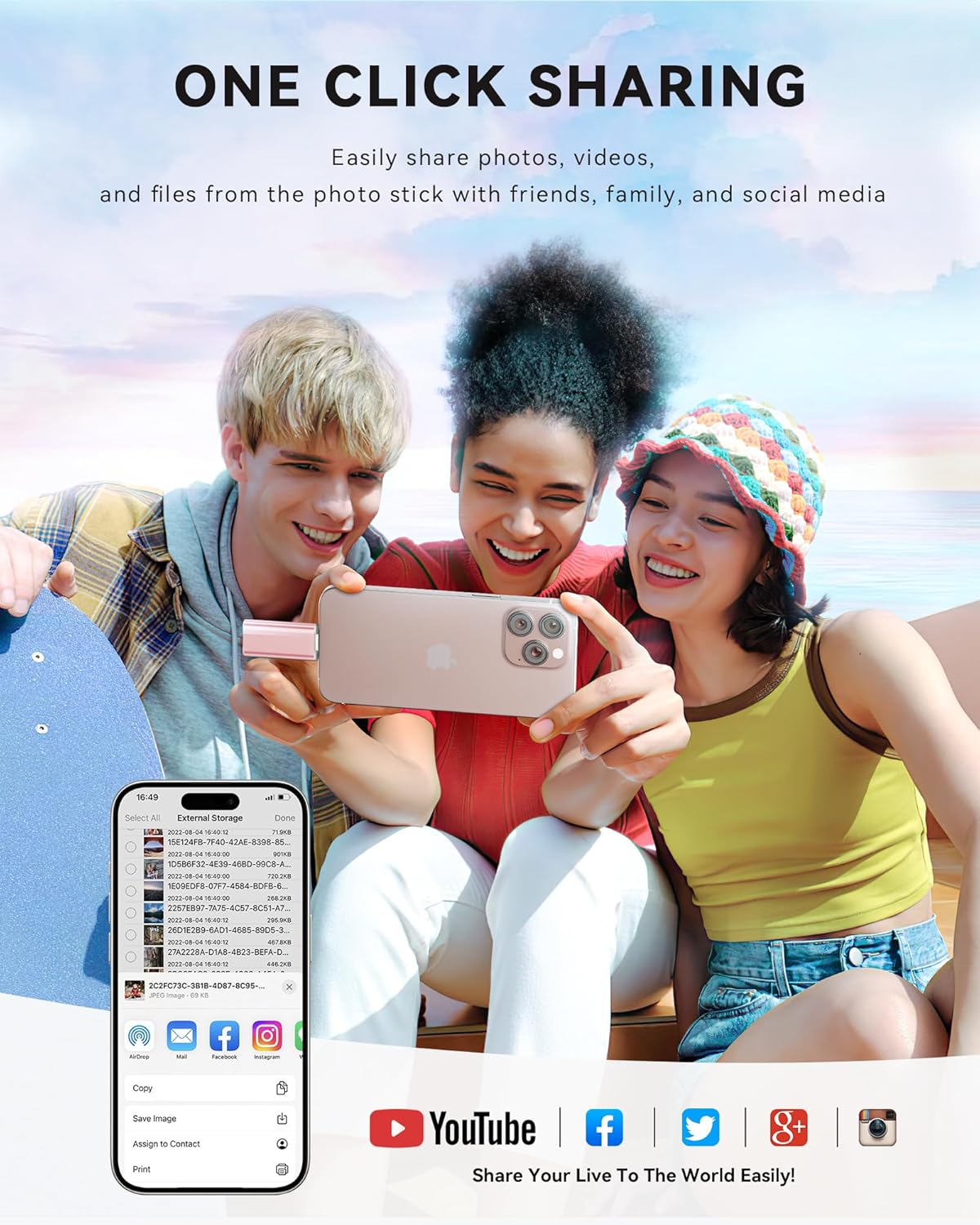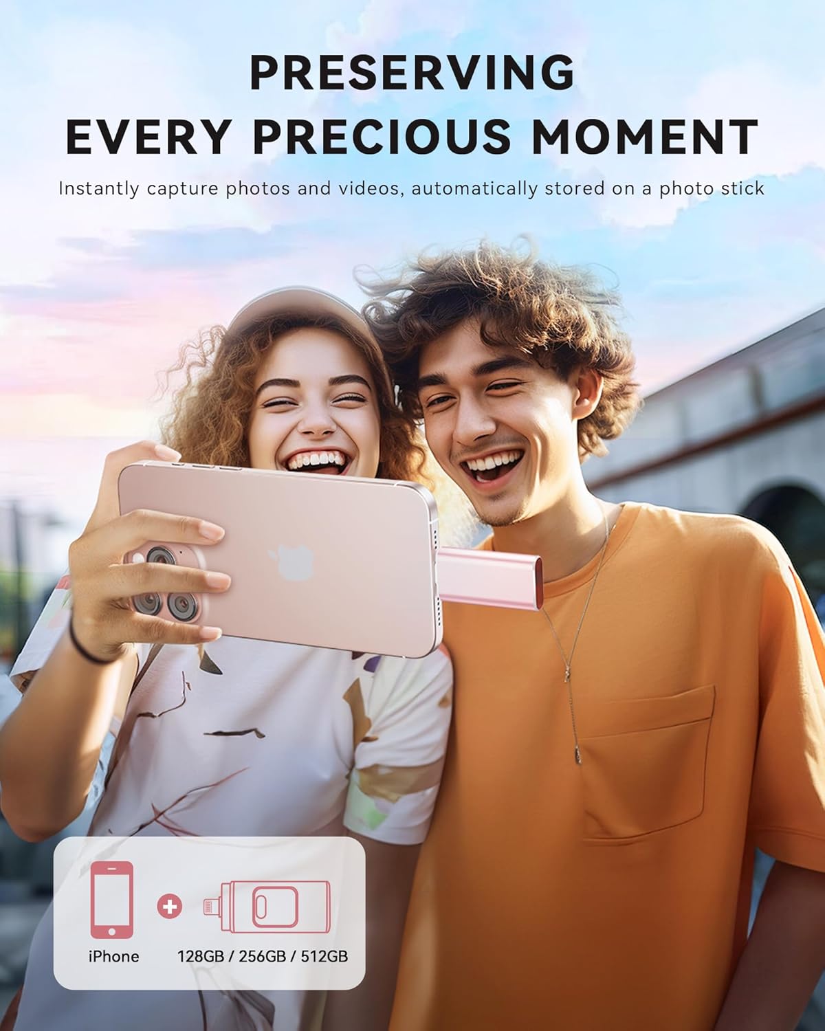 - Compact & Convenient: This MFi-Certified 512GB iphone photo storage stick helps you solve storage issues on your iPhone/iPad/PC, allowing you to easily back up your photos, videos, and phonebook with just one click using the app USB drive. (Note: To use this iphone memory stick on an iPhone/iPad, please download and install the "ROSPE" app from the App Store. For Android phones, simply enable the OTG function, no need to download any additional apps.)