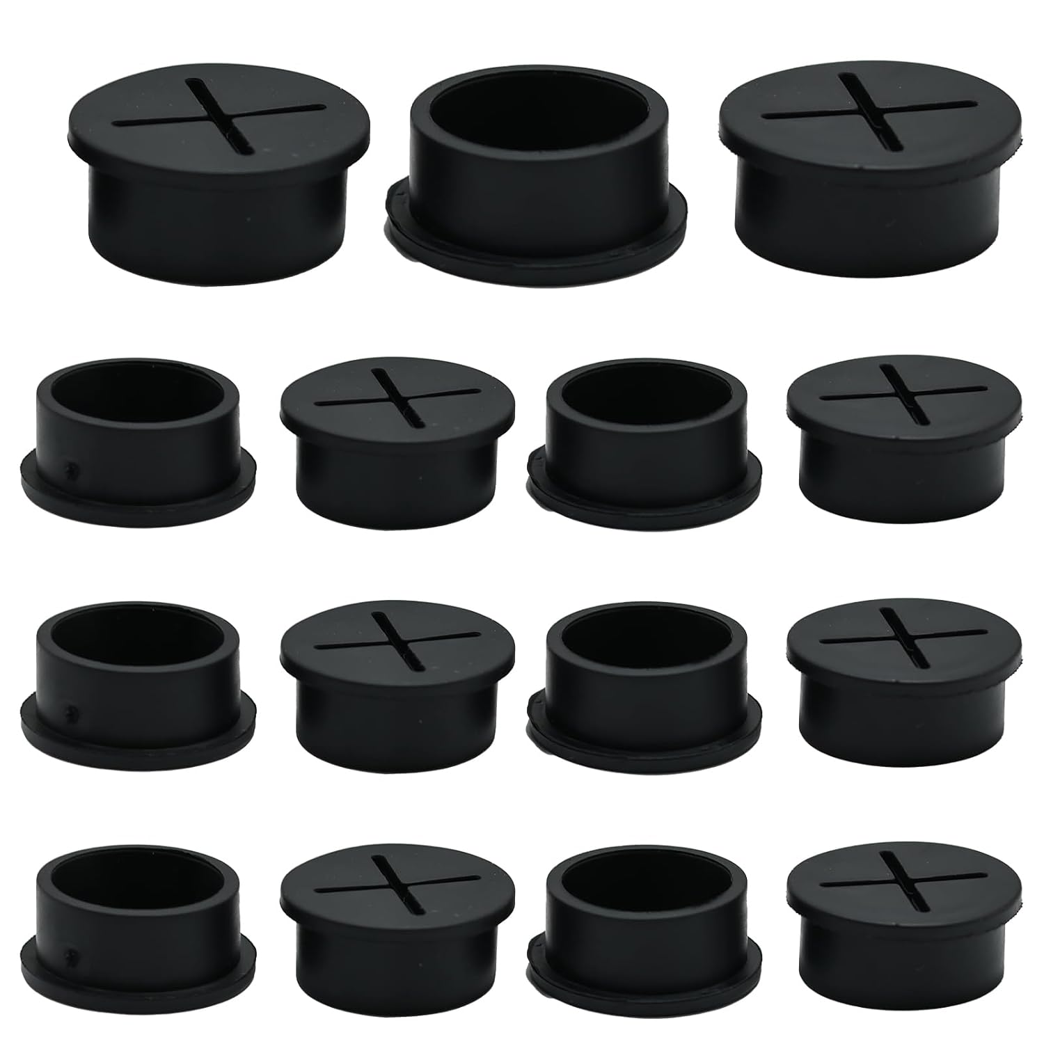 - Dimension and Quantity: 15 black desk grommets, + shape desk cord hole cover 1 inch (25 mm) diameter, 1-1/8 inch (29 mm) overall diameter, 1/2 inch (12 mm) height, 3/4 inch (20 mm) through-hole diameter, 5/64 inch (2 mm) thicker