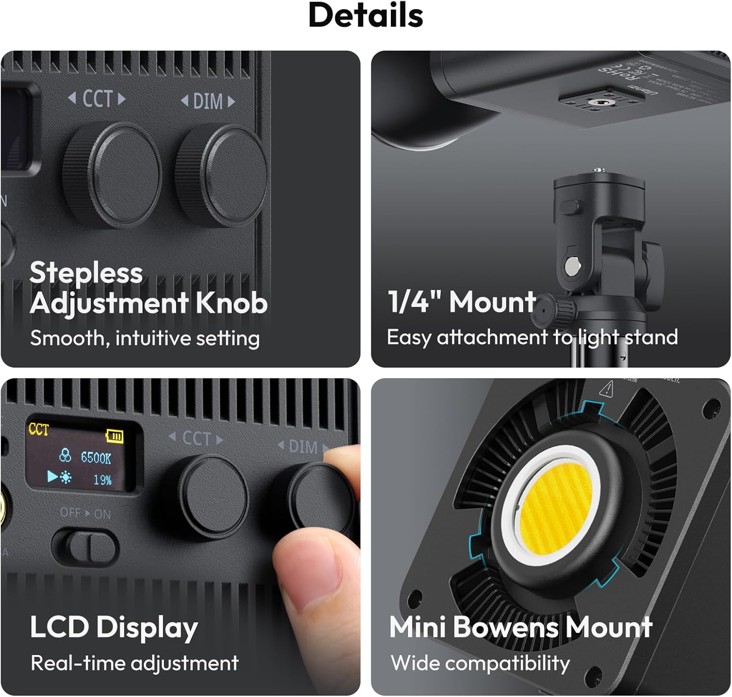 - 【LCD Display & Mini Bowens Compatibility】Real-time adjustments via LCD display and wide compatibility with Mini Bowens mount for seamless integration with various accessories.