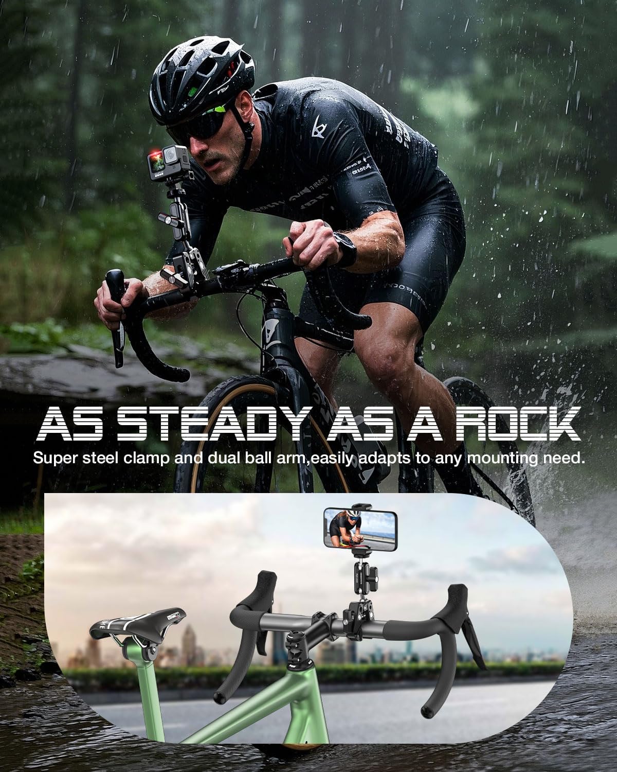 - 【STANDARD INTERFACE, EXTENDS COMPATIBILITY WITH MULTIPLE DEVICES】 This multifunctional clamp comes with a 1/4" screw mount ball head. The package includes a phone holder and GoPro mount adapter, supporting phones (2.2-3.3"/55-85mm) and action cameras. Compatible with iPhone, Samsung Galaxy, GoPro, DJI Osmo, Insta360, and more.