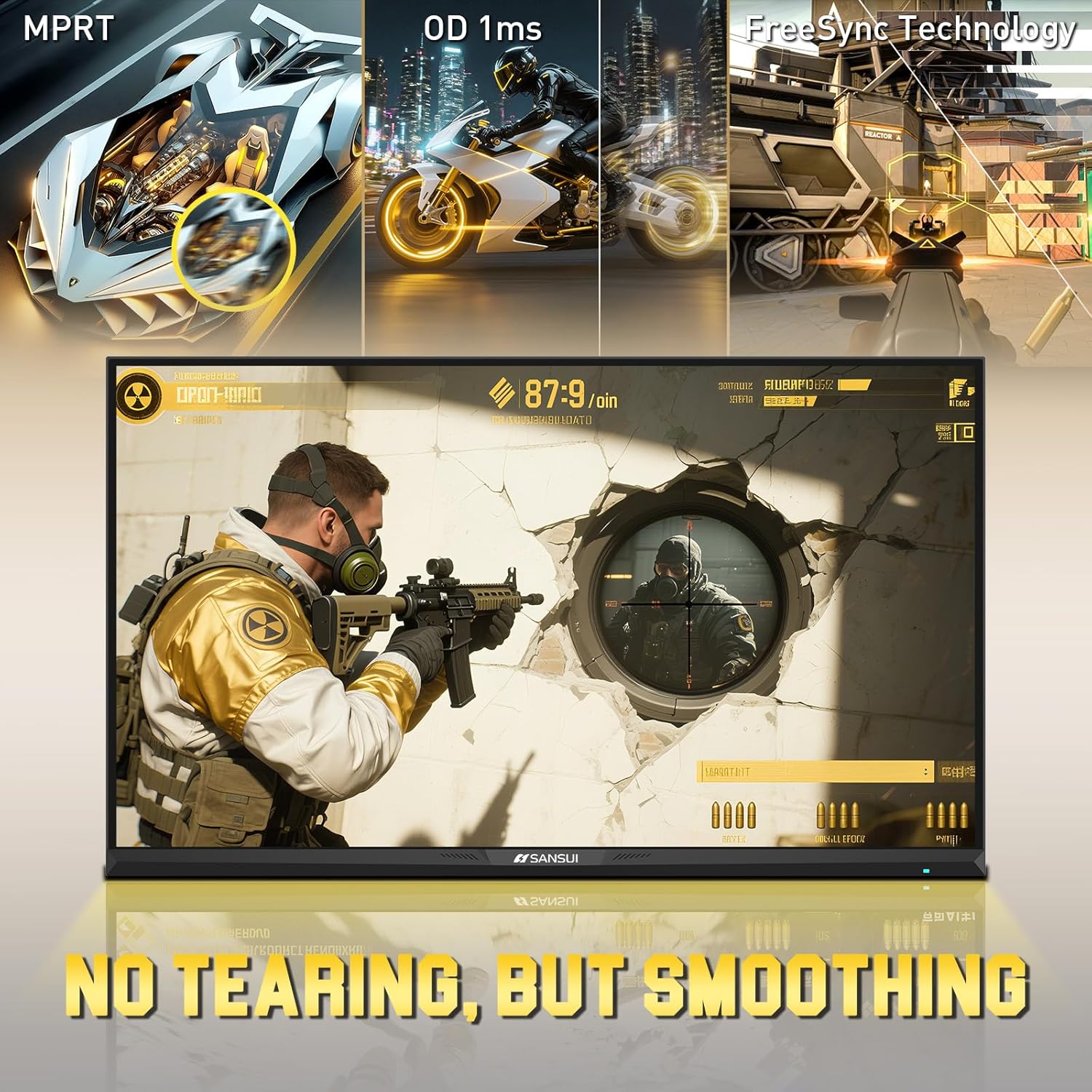 - Soomth Gaming - 300Hz refresh rate, fast IPS panel, FreeSync technology, 1ms OD/MPRT response time; CrossHair /Timer /RTS /FPS /RACING game assistants