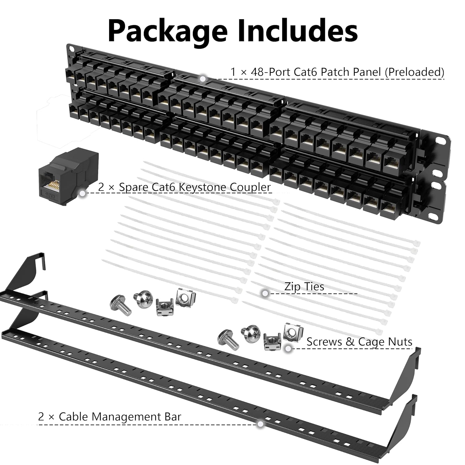 - 🔹 Includes Mounting Hardware & Spare Keystones – Comes with screws, cage nuts, and zip ties for hassle-free rack or wall mounting. Plus, we include 2 extra Cat6 couplers for quick replacement, so your network never goes down.