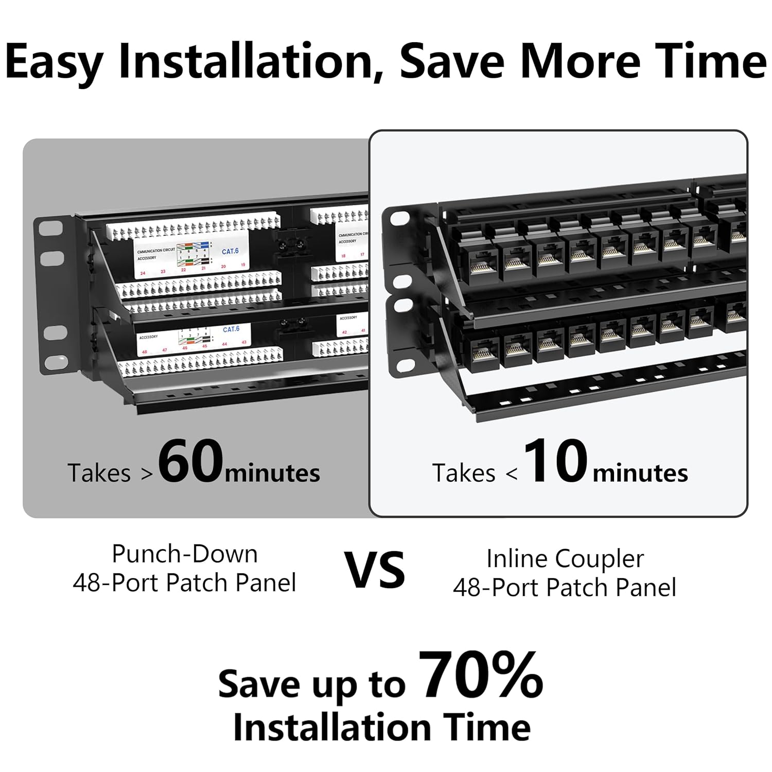 - 🔹 No Tools Needed, Save Setup Time – Preloaded with 48 Cat6 RJ45 couplers, this patch panel lets you plug cables directly without punch-down tools. Installation takes only minutes, saving up to 70% time compared to traditional panels.