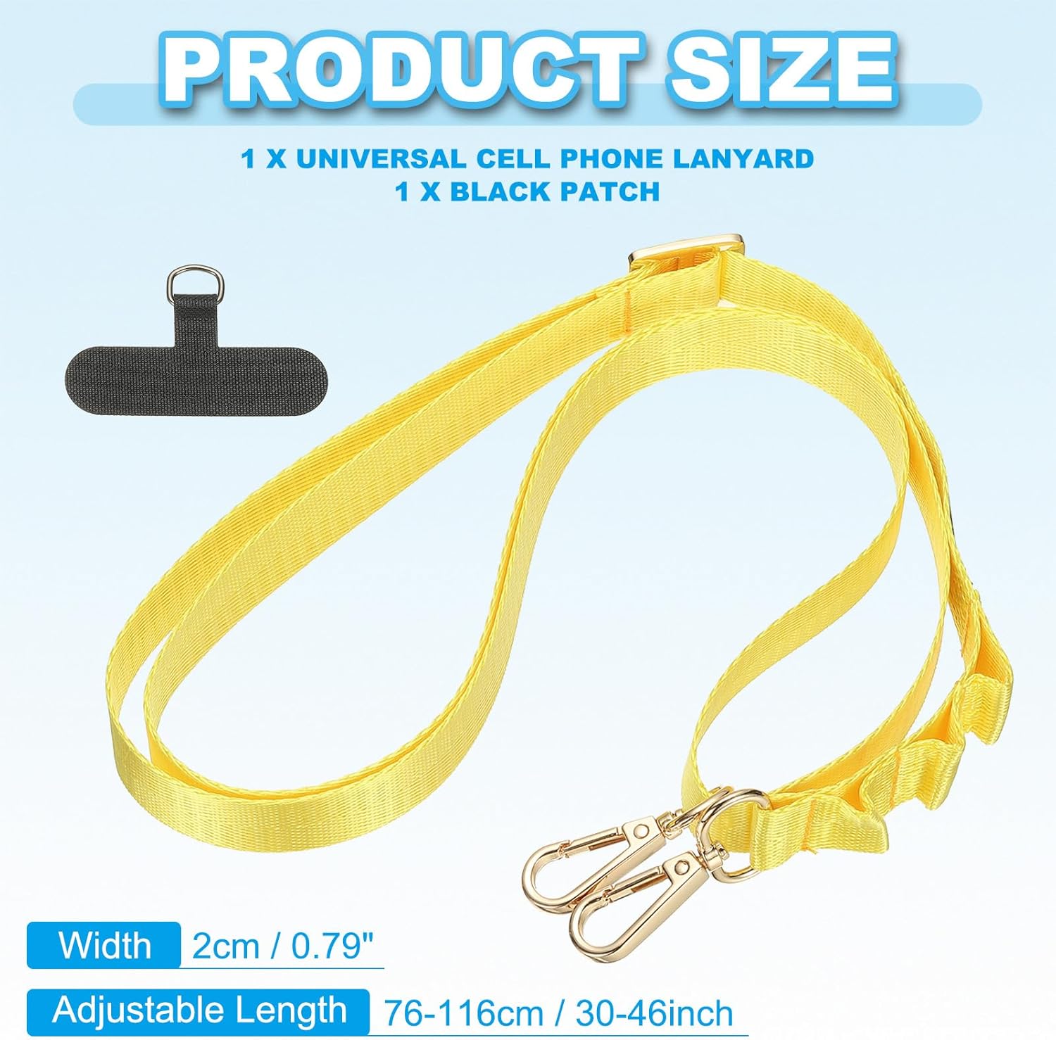 - Specification: Color: Yellow; Material: Polyester; Width: 2cm / 0.79 inch; Adjustable Length: 76-116 cm / 30-46 inch; Packing List: 1 x Universal Cell Phone Lanyard, 1 x Black Patch