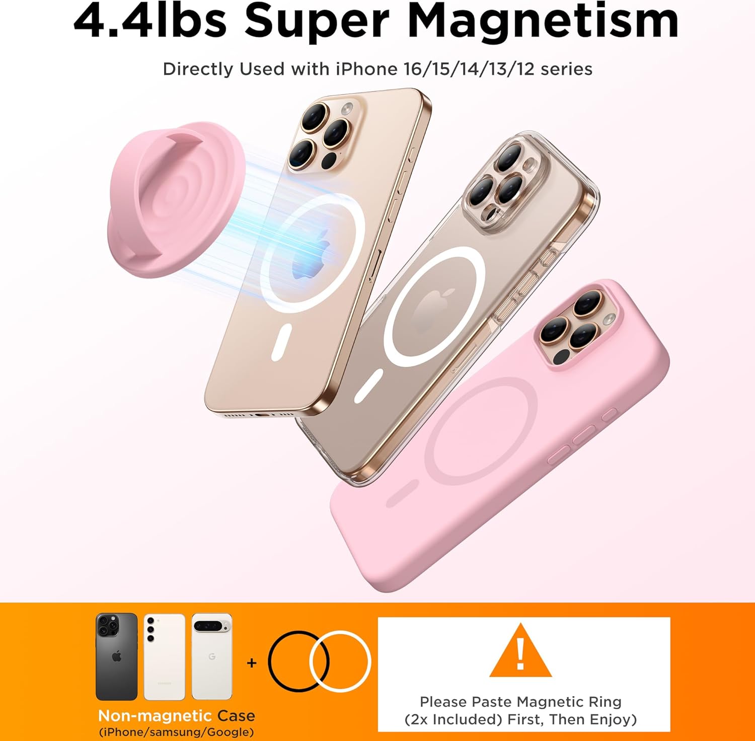 - 【Wide Compatibility】The magnetic phone grip is compatible with iPhone 16/15/14/13/12 series, Suitable for MagSafe phone cases, included 2 separate magnetic metal rings for other magnetic phones or can be used with a magnetic phone case to meet the needs of different users