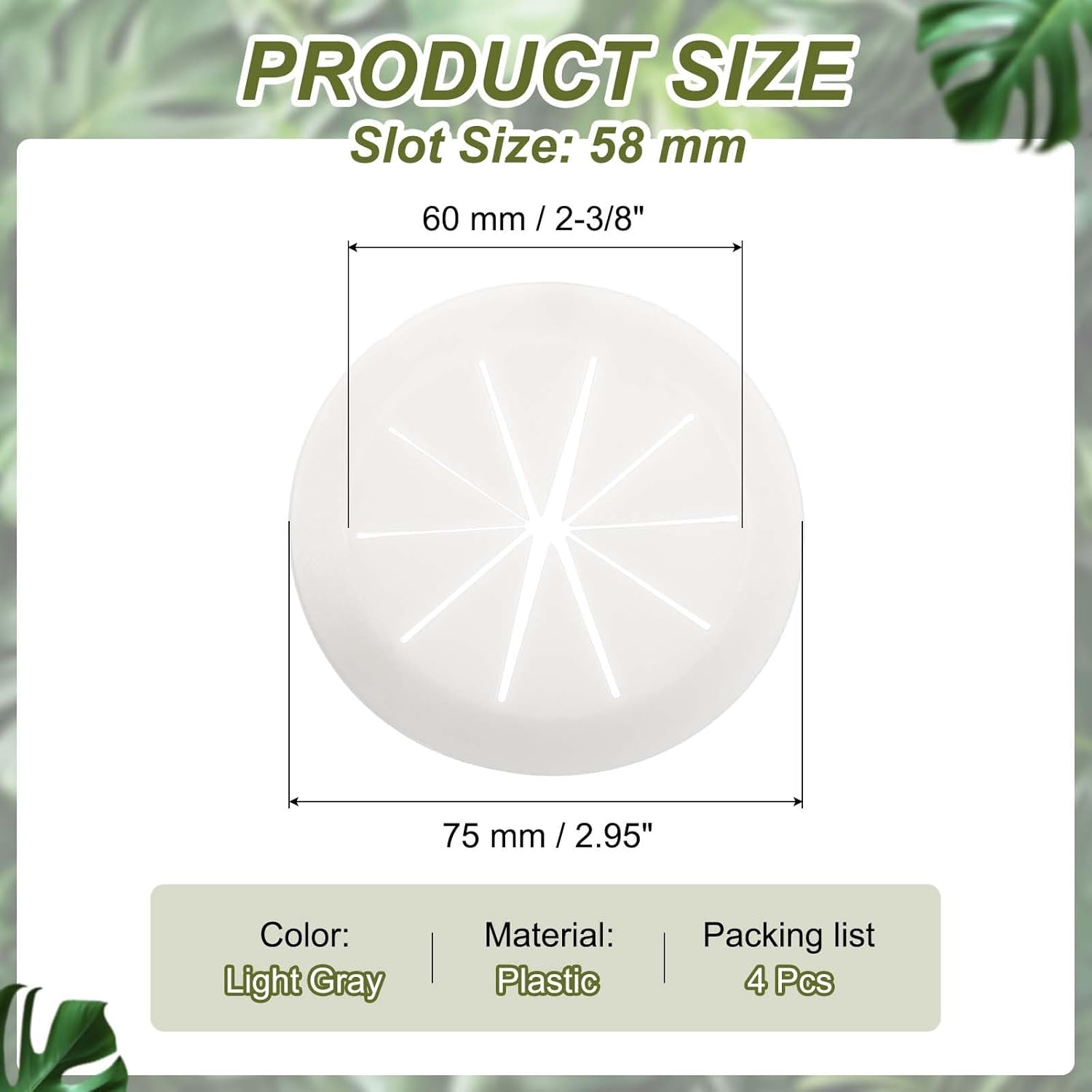 - Color: Light Gray; Material: Plastic; Inner Diameter: 60 mm / 2-3/8"; Slot Size: 58 mm / 2.28 inch; Total Size: 75 mm / 2.95 inch; Packing List: 4 Pcs x Desk Grommet