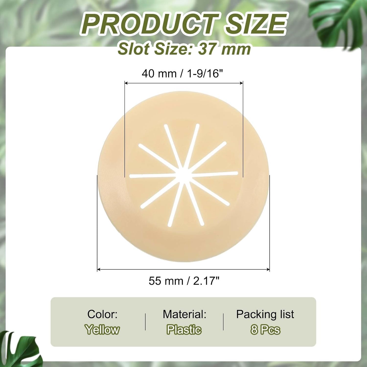 - Color: Yellow; Material: Plastic; Inner Diameter: 40 mm / 1-9/16"; Slot Size: 37 mm / 1.46 inch; Total Size: 55 mm / 2.17 inch; Packing List: 8 Pcs x Desk Grommet