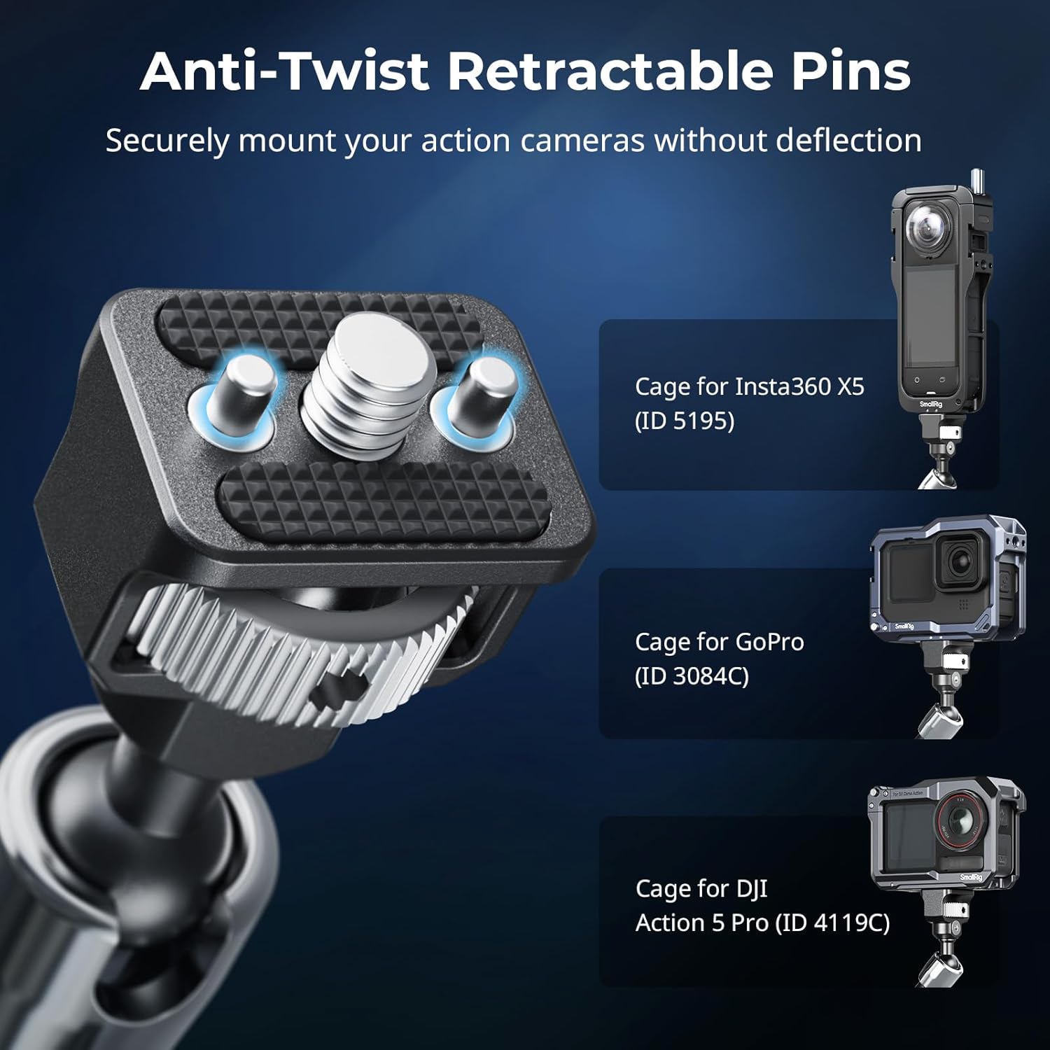 - Wide Compatibility: Magic arm comes with one end features a 1/4"-20 screw and retractable pins to connect any on-camera flashlights, microphone, LCD monitor, microphone or action camera. This magic arm effectively prevents twisting of devices, such as cages for GoPro (ID 3084C), for Insta360 X4 (ID 4278), and for DJI Action 5 Pro (ID 4119C). NOTE: The maximum payload is 1.5kg (3.3lb).
