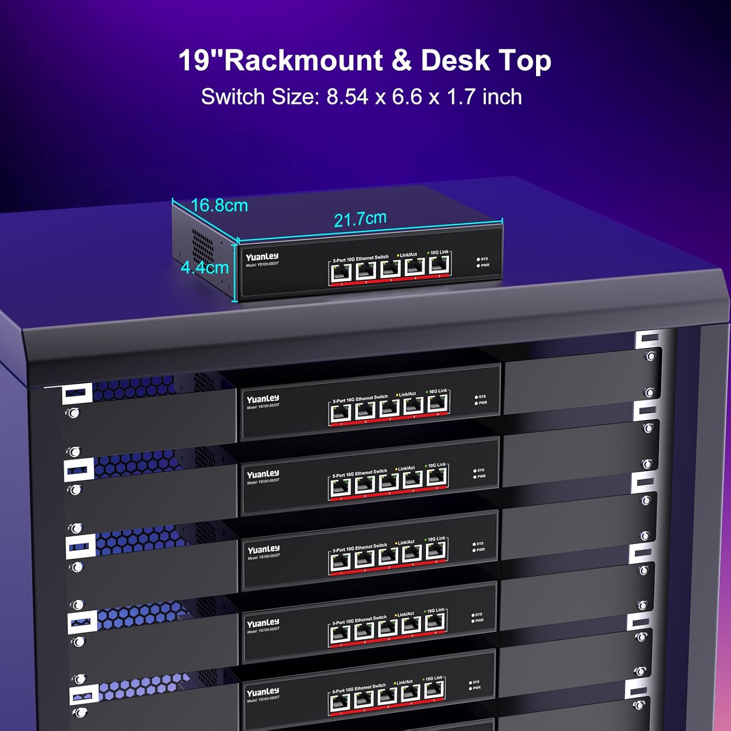 YuanLey 5 Port 10G Ethernet Switch, 5 x 10Gbps RJ45 Ports, Support 10G/5G/2.5G/1G/100Mbps Speed Auto-Negotiation, 100Gbps Switching Capacity, Unmanaged Switch Rackmountable, Plug and Play
