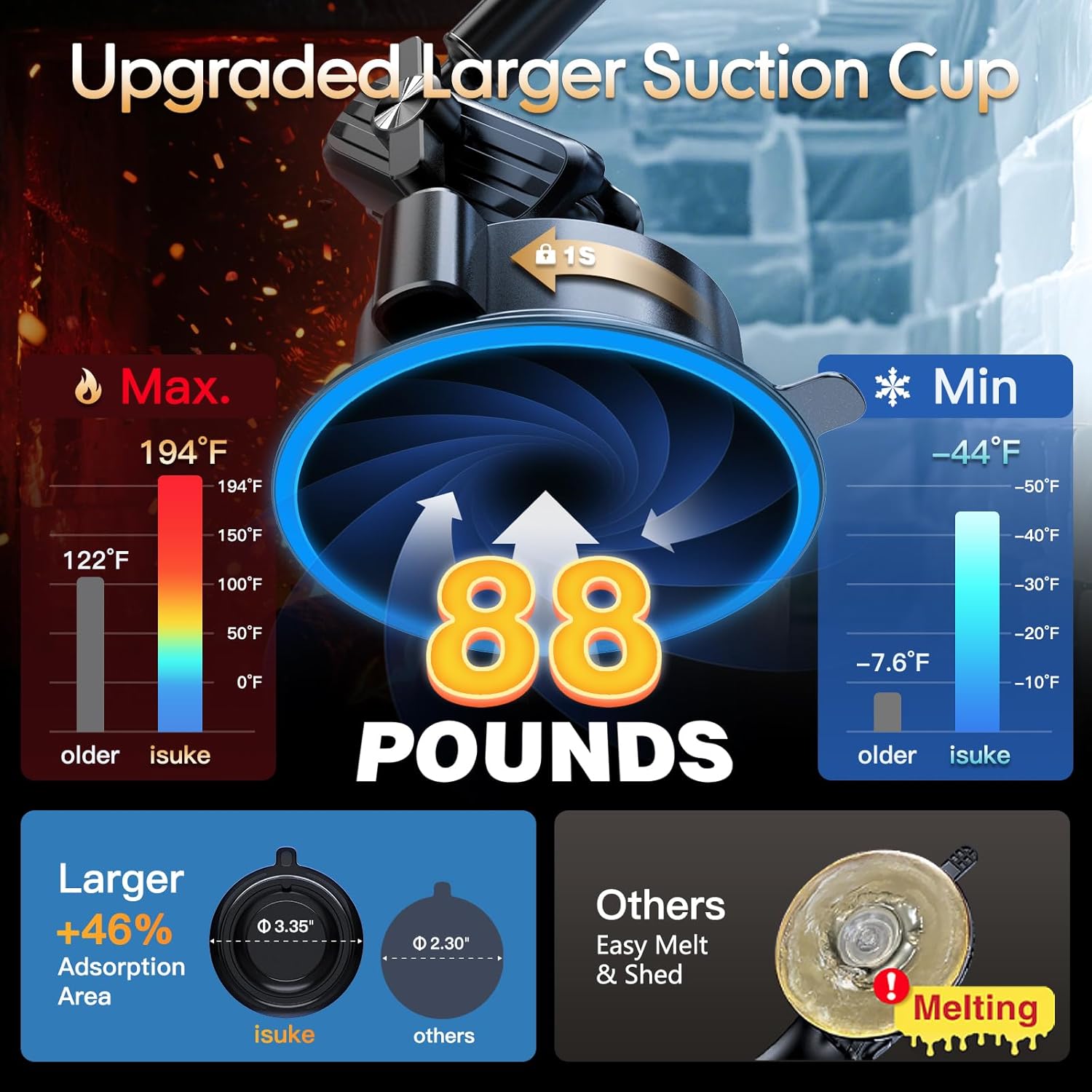 - [Superior Suction Cup, Never Fall Off] Different from other suction cups on the market, this car phone holder equipped with latest big suction cup and 2-level locking, large 3.35” Diameter of suction cup mechanism has been tested out by isuke laboratory, 3x stronger than standard suction. Provides up to 80lbs of holding power, ensuring rock-solid stability even on rough roads. Note: ①Make sure that the surface should be smooth. ② Reuse after rinse & air-dry.