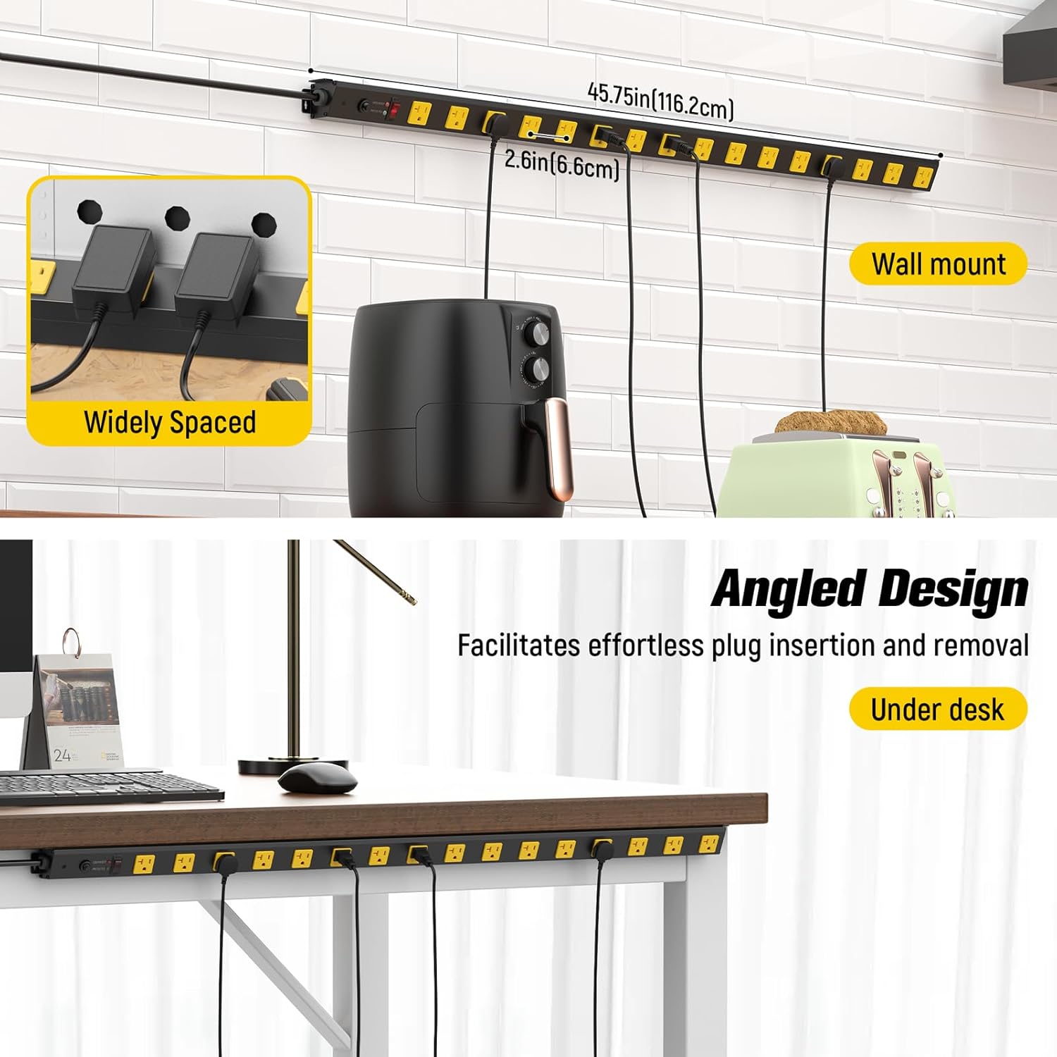 - Metal Wide Spaced Power Strips - This 20 amp Long metal power strip with 16 widely spaced outlets, the distance between the sockets is 2.6inch, Widely spaced design will be suitable for larger plugs. useful in the routing of power for the various components and organize the power cord