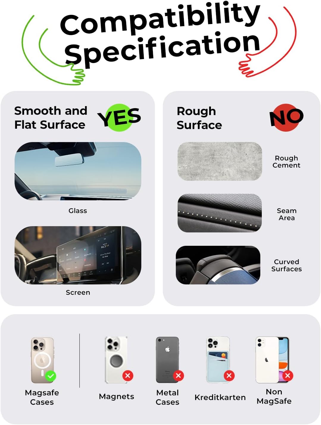 - 🚩🚩🚩Important Installation Information: ① If the Vacuum Magnetic Phone Holder detaches in high temperature conditions, simply reattach it to restore function. ② Do not use on surfaces with large particles, textures, or curves. ③ If the suction cup loses stickiness, rinse with water and air dry (do not wipe with paper towels).