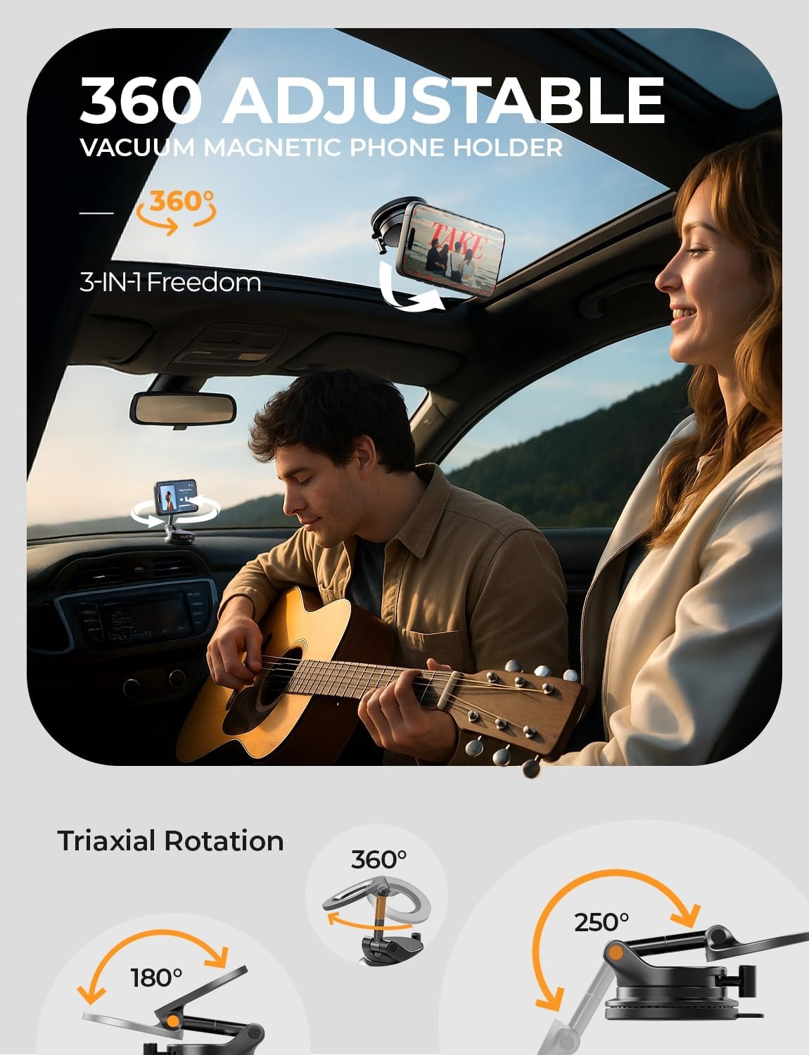 - Tri-Axis Multi-Adjustment delivers clear sightlines, flexible scenarios, and easy control. The head rotates 180° with micro-tilt to cut glare and switch instantly between portrait and landscape. The center arm tilts up/down and toward the passenger for smoother navigation, effortless sharing.The base pitches to anywhere in car, sitting flush for a tighter seal, easier reach, and more mounting positions across the interior.Great for Windshield/Screen/Glass/Mirror/Kitchen/Bathroom/Gym/Treadmill.