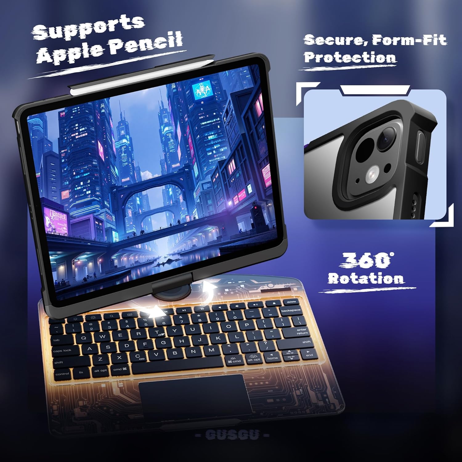 - 360° Rotating Stand & Multiple Viewing Angles: Experience complete flexibility with the 360° swivel base, featuring five adjustable angles. Whether you're typing, drawing, or watching videos, easily adjust your iPad for optimal comfort and efficiency in any position.