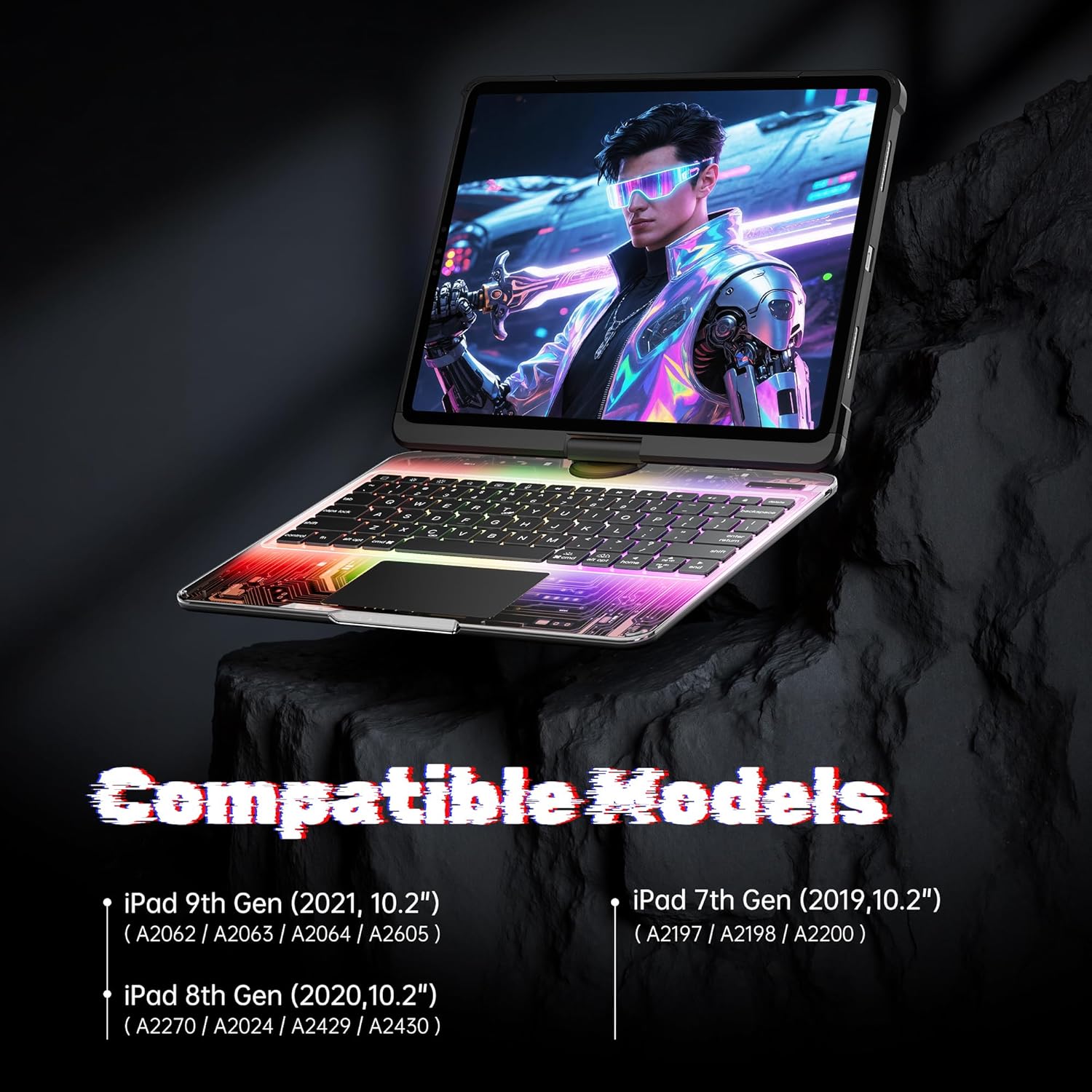 KITONE Transparent Case with Wireless Keyboard for iPad 10.2-in (7th, 8th, and 9th Gen), 7 Colors Backlight, Trackpad, 360°Rotating Stand, Tech Style