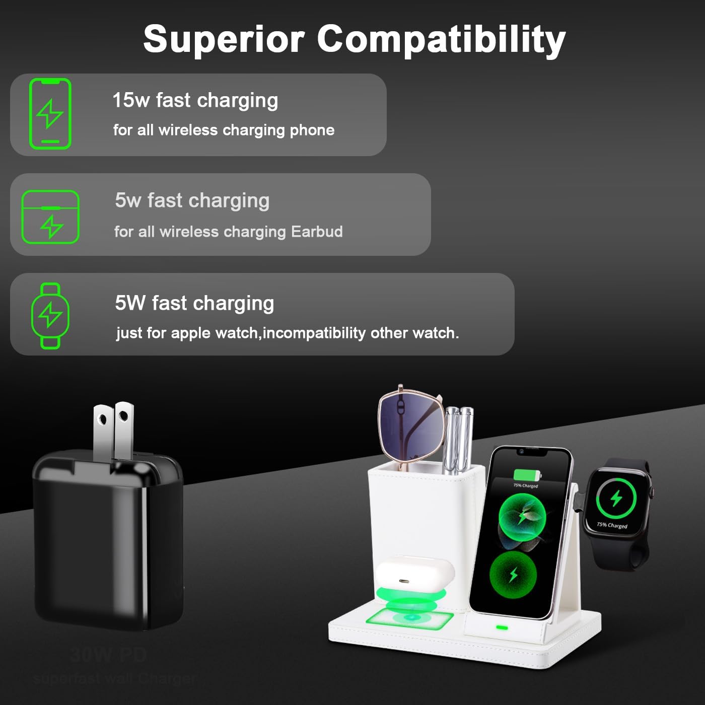 White Leather Pen Holder Desk Organizer with 3-in-1 Wireless Charger for Phone, Earbuds, Watch - Desktop Phone Stand,birthday gifts for women,mom gifts (white)