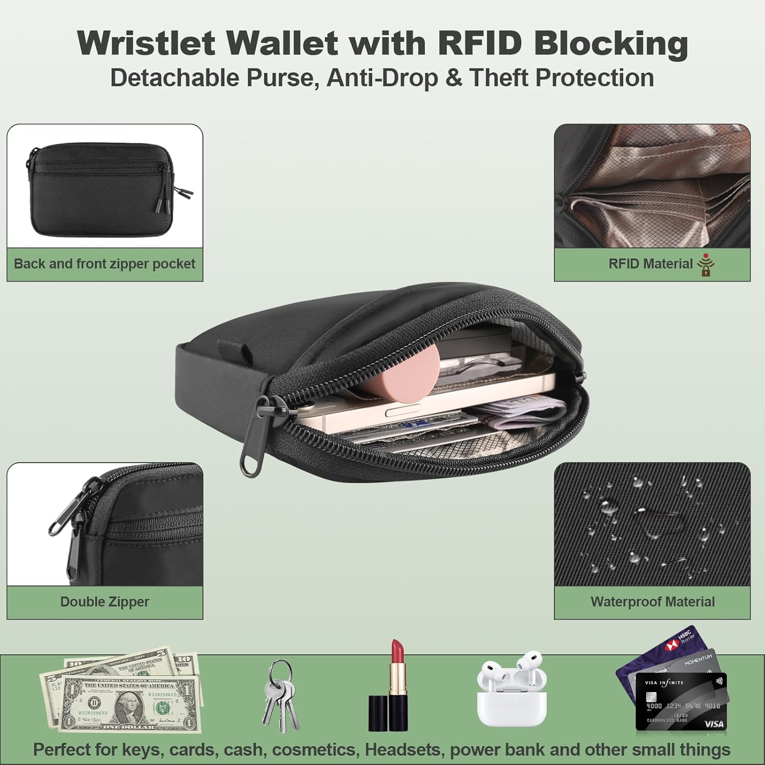 - Detachable RFID Wallet: This versatile wristlet wallet (6.3" L x 4.3" W x 1.2" H) is crafted from durable, waterpoof nylon and features RFID-blocking technology to protetct your cards from unauthorized scanning. It offers ample storage space - with 3 zippered compartments, a large main pocket, interior open pocket, 3 card slots, interior slip pocket, rear zip pocket, and front zip pocket. keep your essentials organized, secure, and easily accessible—perfect for travel, errands, or everyday use!