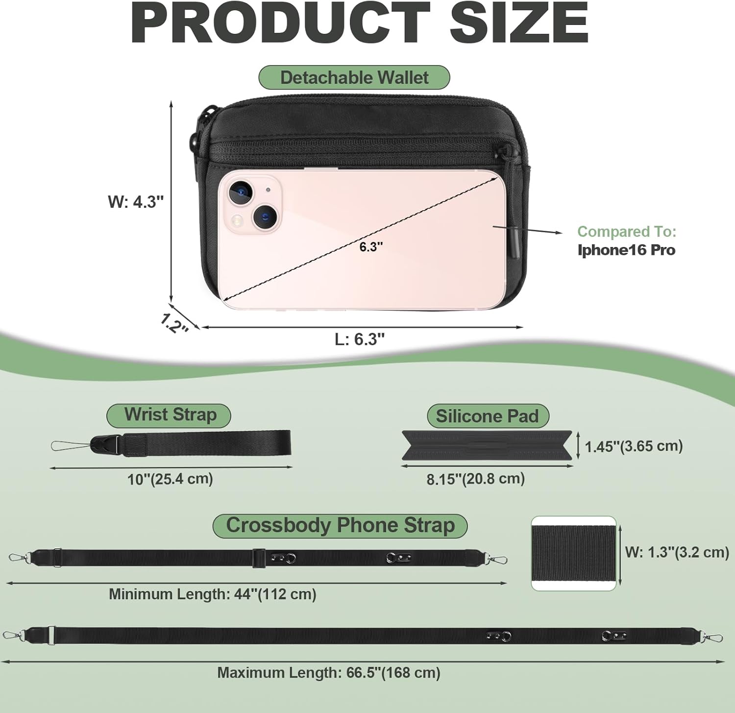 - Universal Fit, Multi-Function: This phone lanyard crossbody is designed to be compatible with smartphones with full-coverage cases. Moreover, it's not just for phones! You can easily hang cameras, wallets, keys, bags, water bottles. the detachable wallet itself can fit cell phones up to 6.3" and offers generous storage for your cash, cards, wireless earbuds, cosmetics, tissues, and other small essentials, it's an perfect partner for your outdoor activities, travels and hikes.