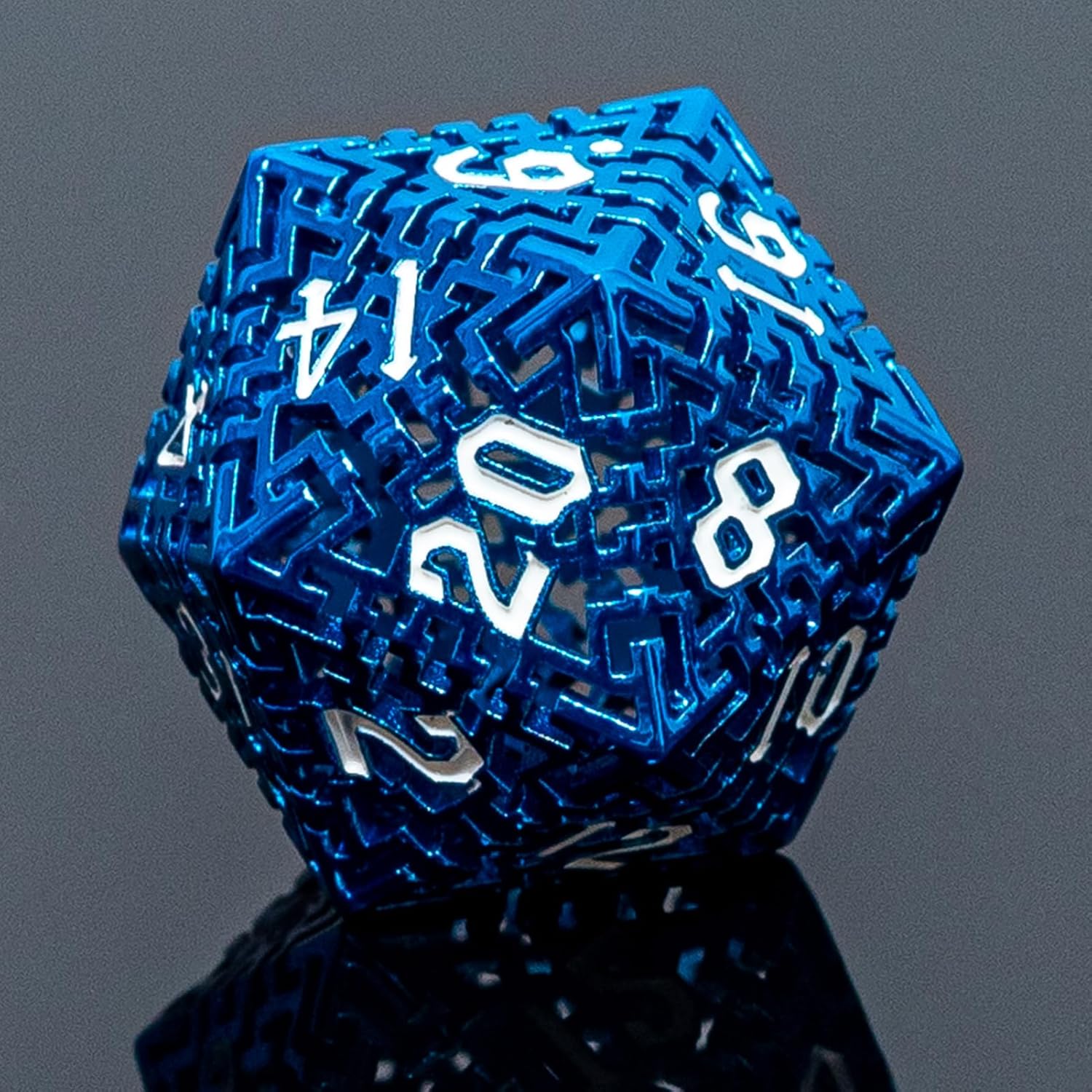 Blue Metal Hollow DND Dice Set (Wizard) Metallic Luster Maze Design with Storage Box - Balanced Weight 7 Piece Zinc Alloy, designed for Dungeons and Dragons DMs and Players RPG Accessories