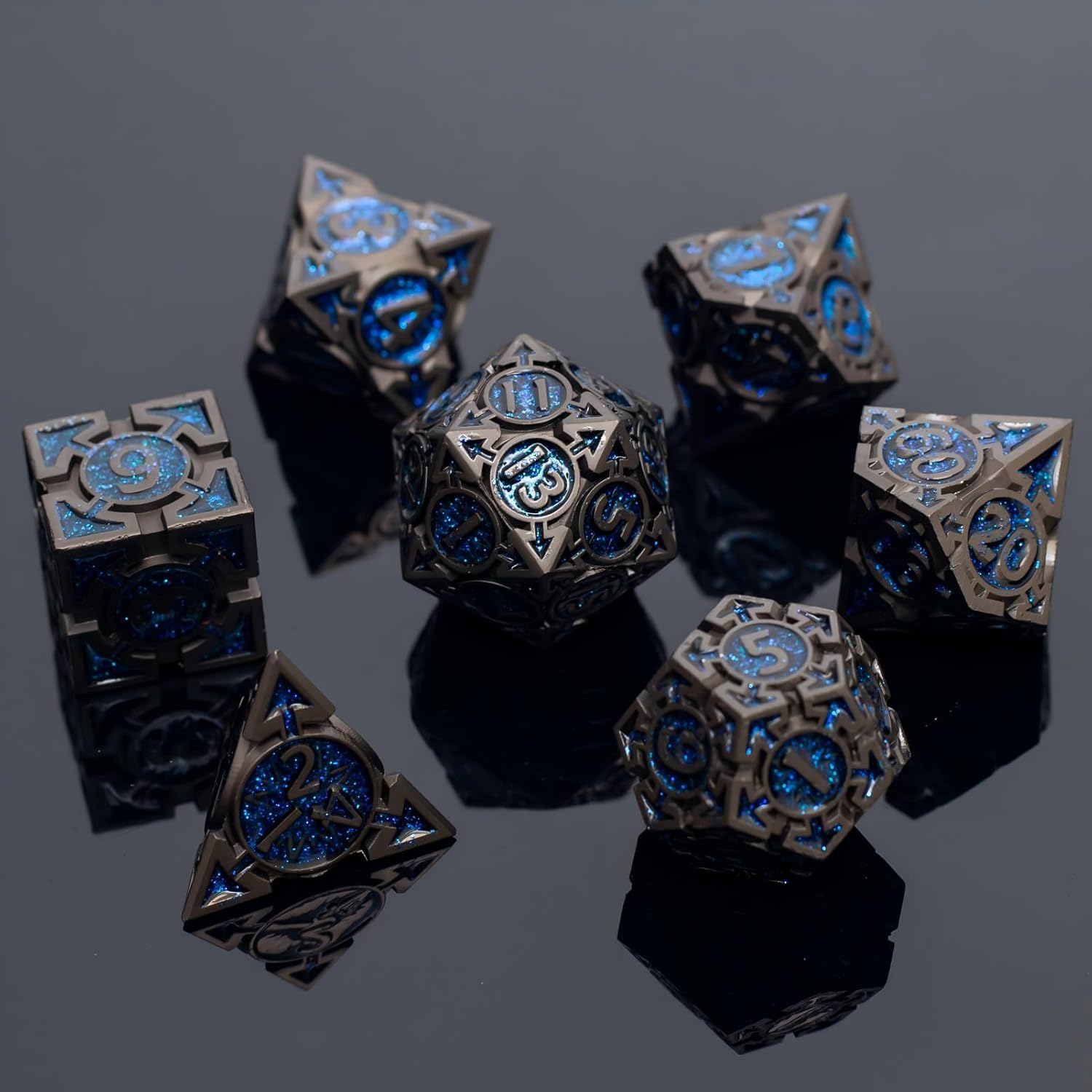 Blue Black Nickel Finish Heavy Metal DND Dice Set (Wizard) with A Metal Box, Sharp Edge Zinc Alloy D&D Accessories, D4-D20, Designed for Dungeons & Dragons Master, RPG Player, Starter