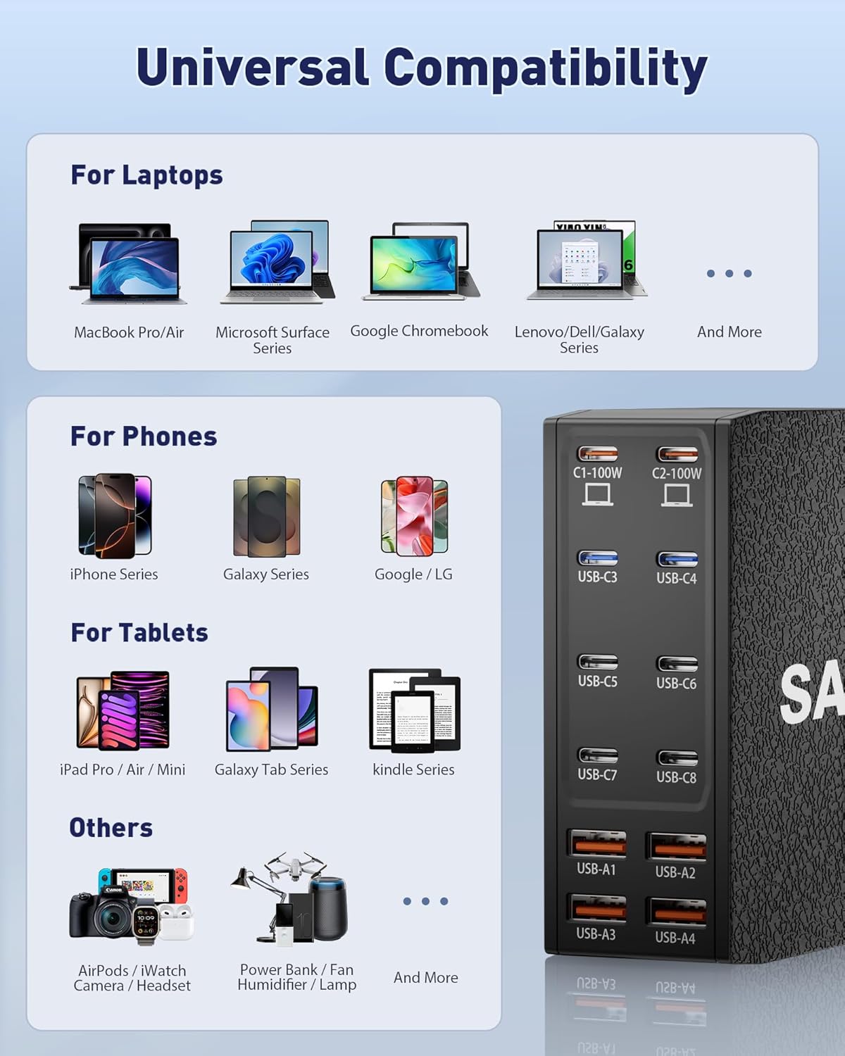 - ăUniversal CompatibilityăOur USB C charging station is equipped with 2*100W and 2*65W fast charging ports, which can charge 3 or more laptops at the same time. Compatible with smartphones, tablets and laptops, suitable for MacBook Pro/Air, Dell XPS, iPad Pro, iPhone 16/16 Pro Max, iPhone 15 Pro Max, iPhone 14/13 Pro/12 Pro Max, iWatch, AirPods, Surface Pro, Galaxy S24 Ultra, Switch, Steam Deck, Google Pixel and many other devices.