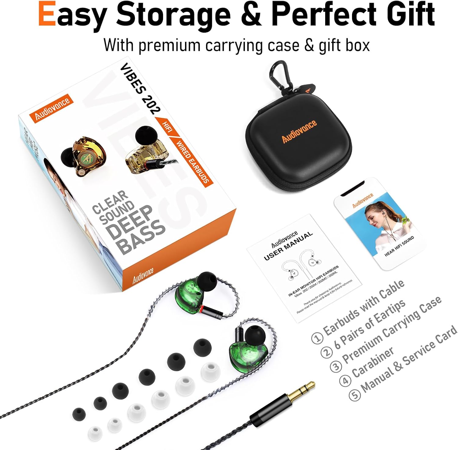 - COMFORTABLE FIT & NOISE ISOLATION - Ergonomically designed to fit the ear canal, Vibes 202 IEM headphones feature preformed over-ear earhooks for a secure fit and keep cables out of the way. With 6 pairs of soft, breathable eartips (in 2 colors and 3 sizes), they ensure optimal comfort and stability while effectively blocking ambient noise for immersive listening.
