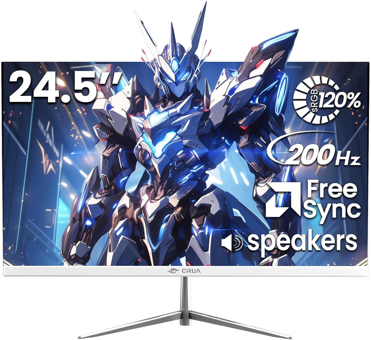 CRUA 24.5" White Gaming Monitor, 200Hz FHD(1920 * 1080P) VA Screen Computer Monitor, Supports Freesync, 120% sRGB, Blue Light Filter, Built-in Speakers, Wall Mountable Installs(HDMI 1.4/DP 1.2)