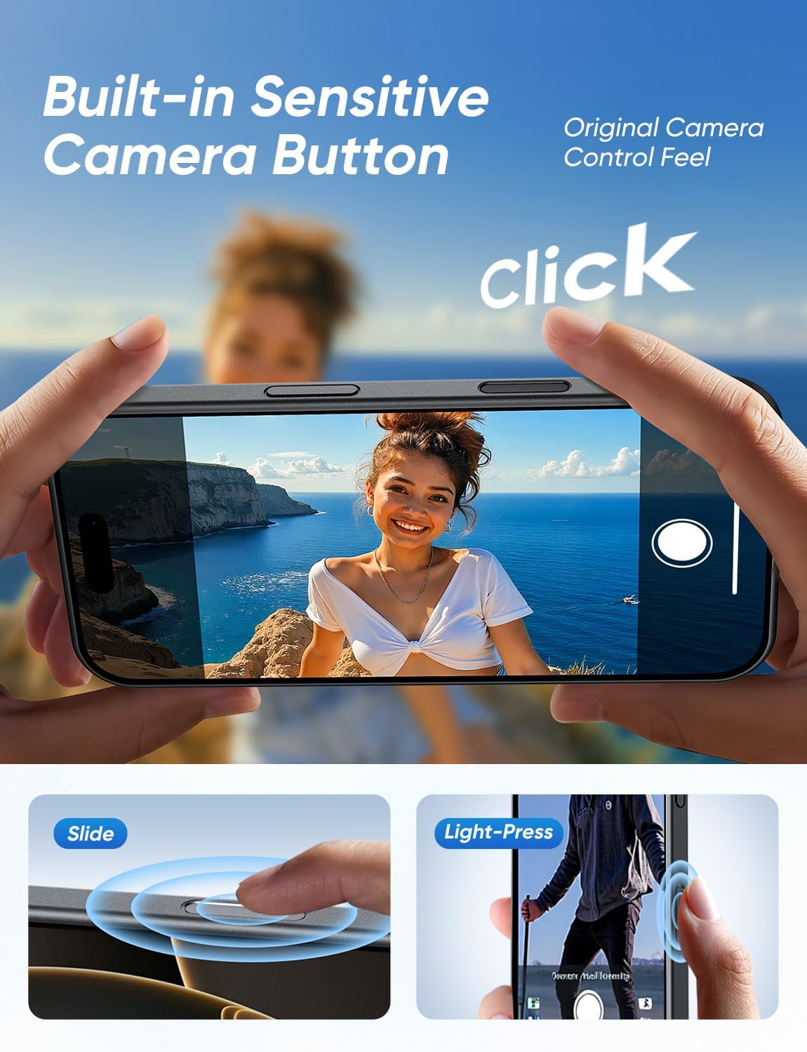 - [Sapphire Glass Camera Control Button Cover] The 16 pro max case photo button cover adopts a sapphire glass touch panel to restore the touch experience of the original button. It is embedded with six high-precision conduction cores to accurately capture each operation in real-time, perfectly matching the pressure and sliding operations of the original buttons. While protecting the original buttons of the device, it enables a smooth touch photo-taking operation with 0 mis-touches and 0 delays.