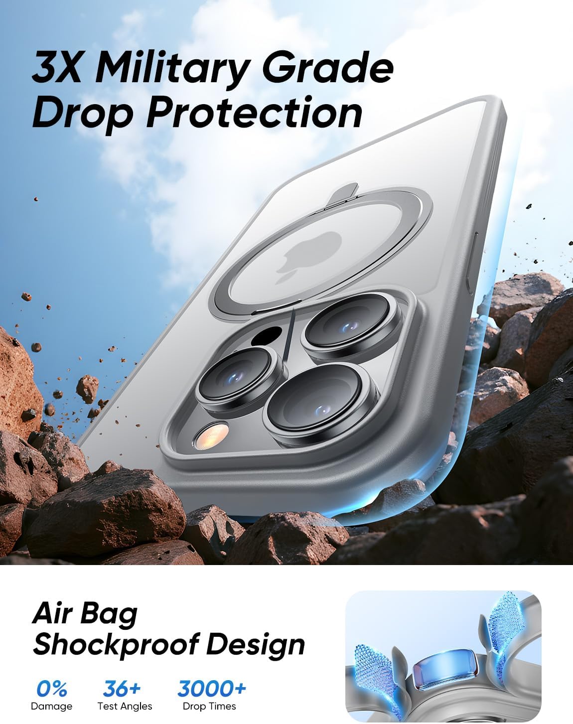 - [360° Seamless Kicktand] Designed for iPhone 15 Pro case incorporates an innovative invisible stand design offers a wide range of angles from 40 to 120° horizontally and vertically, with 360° rotational flexibility. Made with strengthened Aerospace-Grade Aluminum, it withstands over 30,000 open/close authoritative tests while remaining as sturdy as new. When the kickstand is folded, the back is perfectly flush and seamless, adding no bulk. You won't even sense its existence when touching.