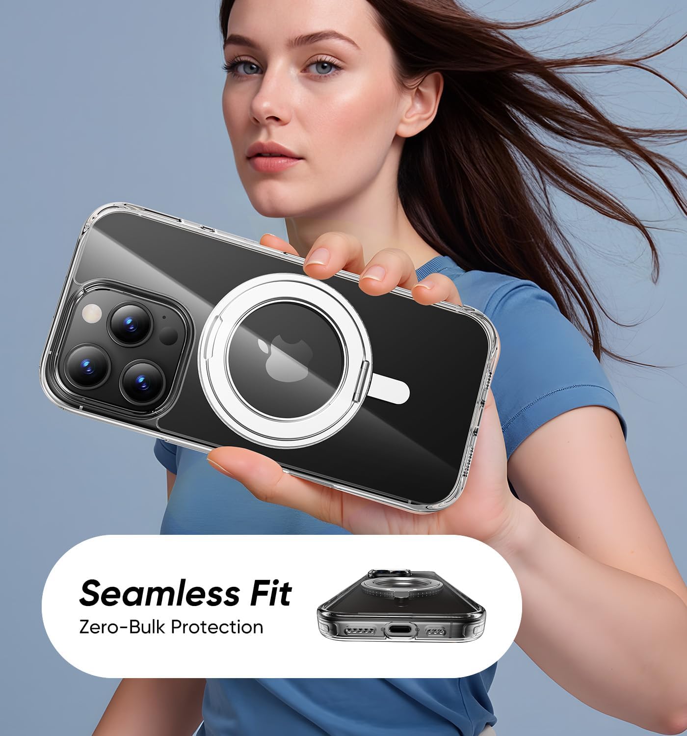 - [360° Seamless Kicktand] Designed for iPhone 15 Pro Max case incorporates an innovative invisible stand design offers a wide range of angles from 40 to 120° horizontally and vertically, with 360° rotational flexibility. Made with strengthened Aerospace-Grade Aluminum, it withstands over 30,000 open/close authoritative tests while remaining as sturdy as new. When the kickstand is folded, the back is perfectly flush and seamless, adding no bulk. You won't even sense its existence when touching.