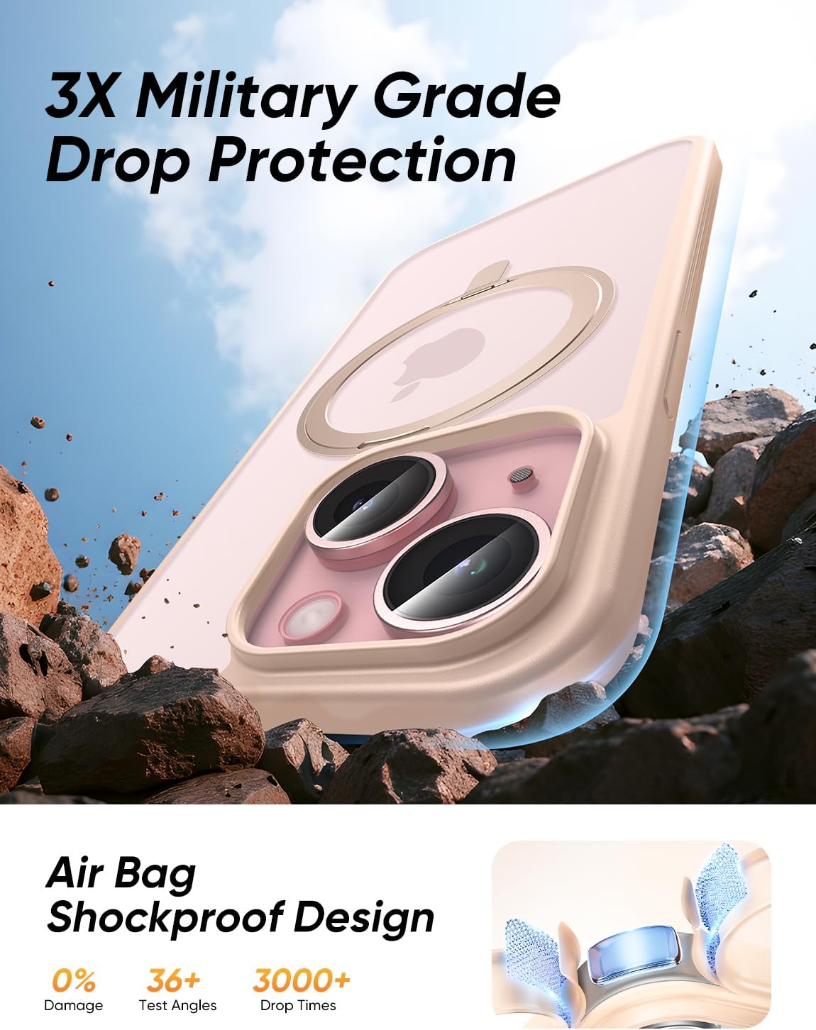 - [360° Seamless Kicktand] Designed for iPhone 15 case incorporates an innovative invisible stand design offers a wide range of angles from 40 to 120° horizontally and vertically, with 360° rotational flexibility. Made with strengthened Aerospace-Grade Aluminum, it withstands over 30,000 open/close authoritative tests while remaining as sturdy as new. When the kickstand is folded, the back is perfectly flush and seamless, adding no bulk. You won't even sense its existence when touching.