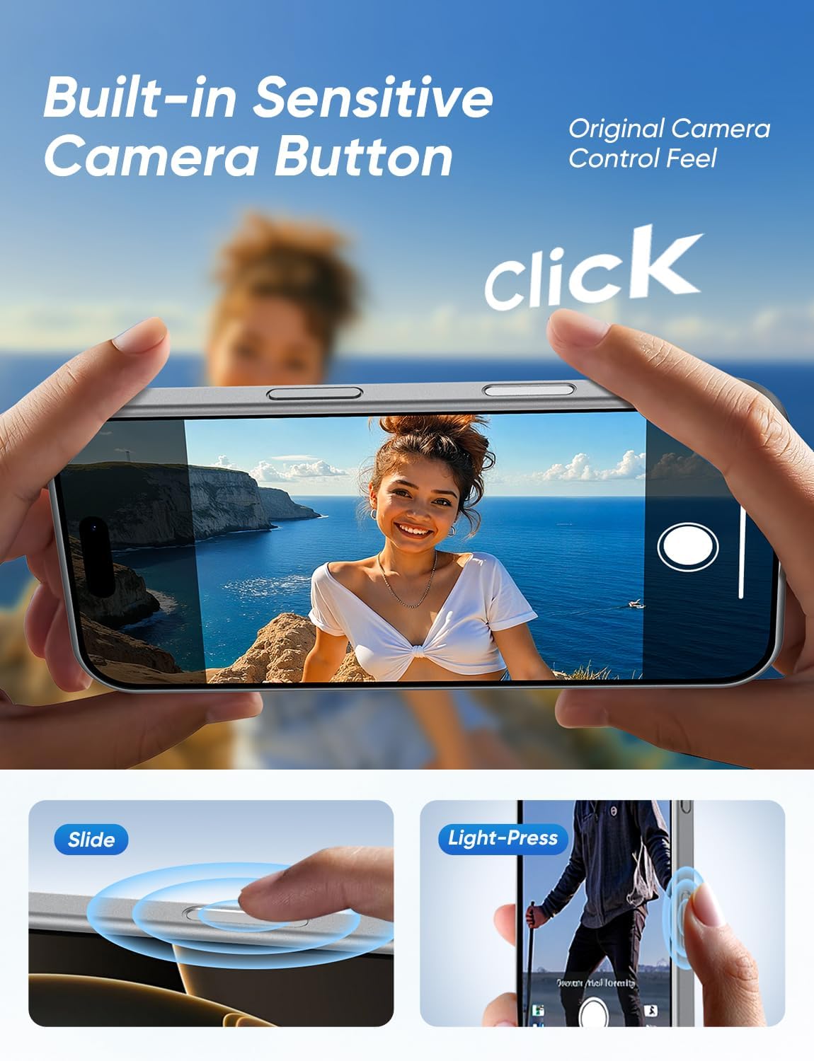 - [Sapphire Glass Camera Control Button Cover] The 16 case photo button cover adopts a sapphire glass touch panel to restore the touch experience of the original button. It is embedded with six high-precision conduction cores to accurately capture each operation in real-time, perfectly matching the pressure and sliding operations of the original buttons. While tecting the original buttons of the device, it enables a smooth touch photo-taking operation with 0 mis-touches and 0 delays.