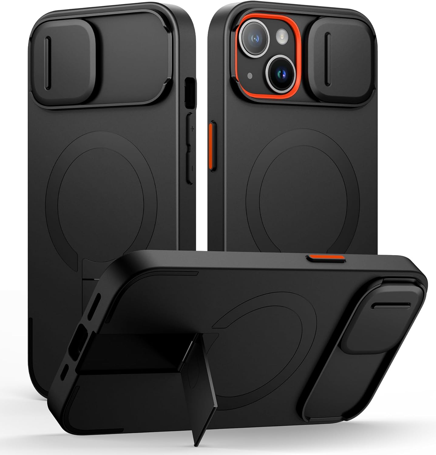 SURITCH for iPhone 15 Case with Magnetic Camera Slide Cover and Adjustable Kickstand, Compatible with MagSafe, Shockproof Bumper Case Slim Protective Cover 6.1 Inch, Black