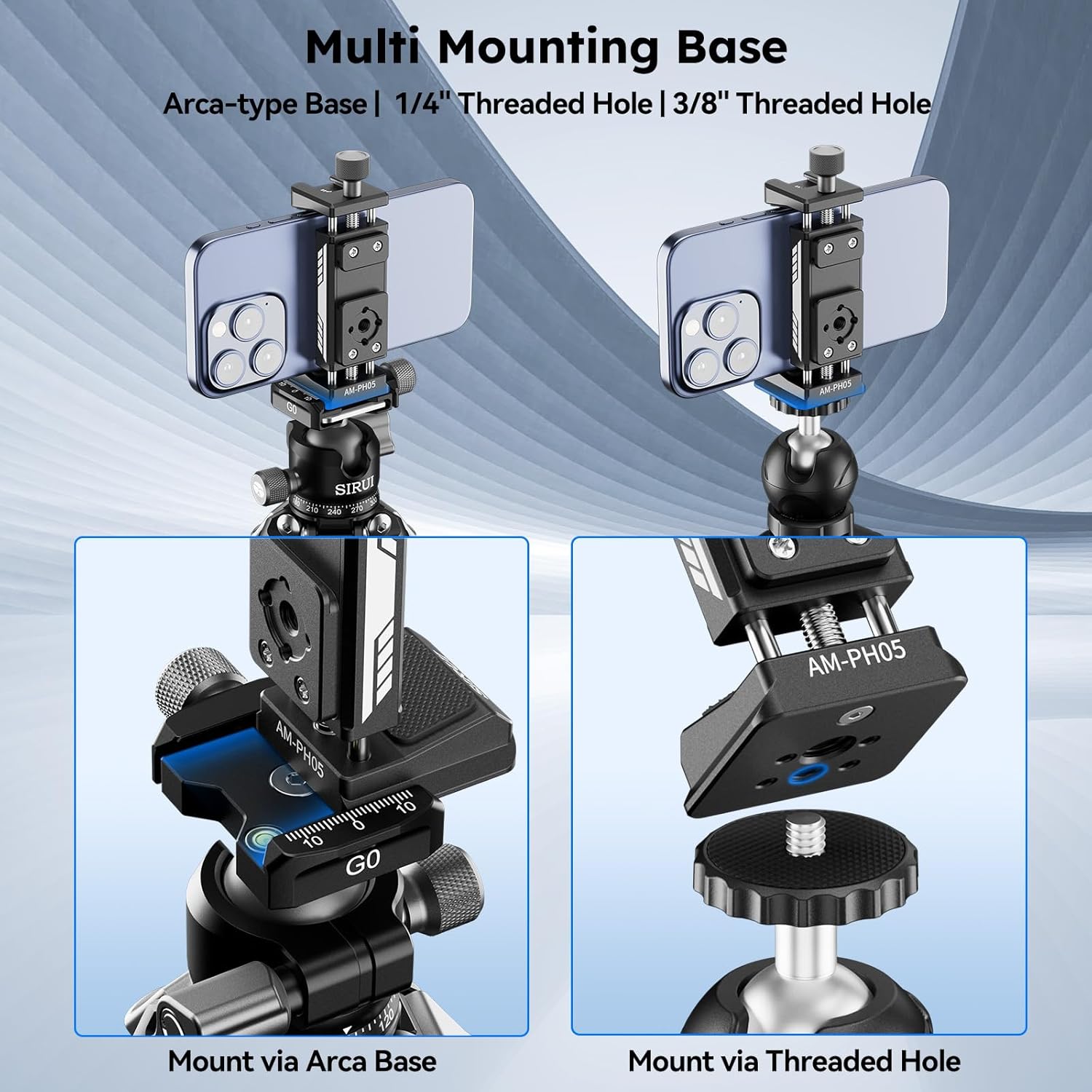 SIRUI Phone Mount for Tripod with Arca Base with 1/4"&3/8" Threaded Holes, Metal Tripod Cell Phone Clamp Holder with 2 Cold Shoes, Smartphone Adapter Compatible with iPhone, Galaxy, Pixel, AM-PH05