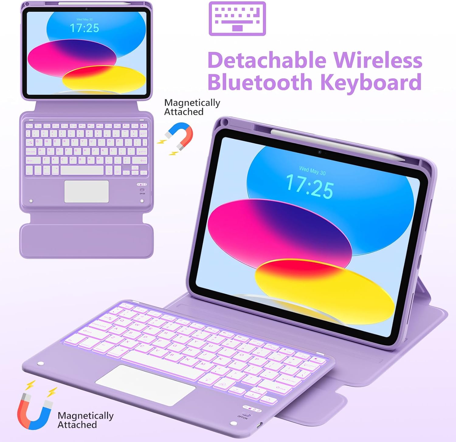 TaIYanG Touchpad for iPad A16 11th/10th Generation Case with Keyboard, 7 Color Backlit 360 Rotation Cover with Pencil Holder,Detachable Keyboard for iPad 11 inch 2025/10th Gen 10.9'' 2022 (Purple)