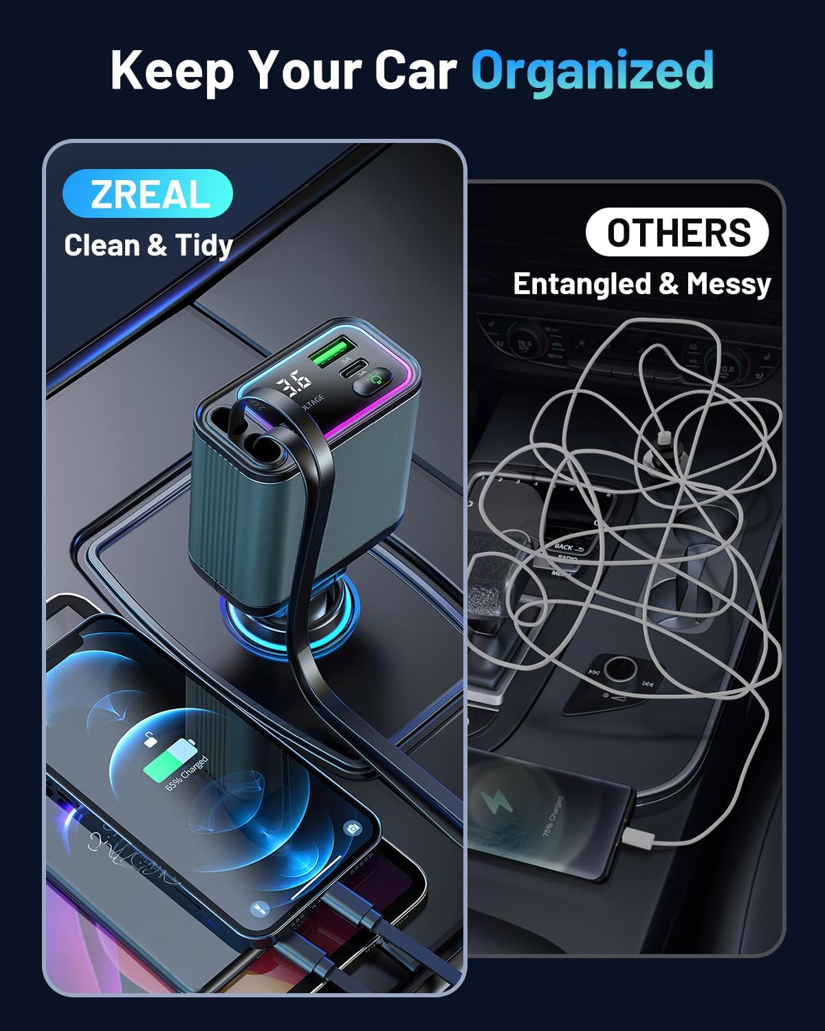 - [Voltage Display & Ambient Lighting] – Stay informed about your car’s power status with the built-in voltage display. The ambient lighting not only makes it easy to locate the charger in the dark but also adds a stylish, modern touch to your car.