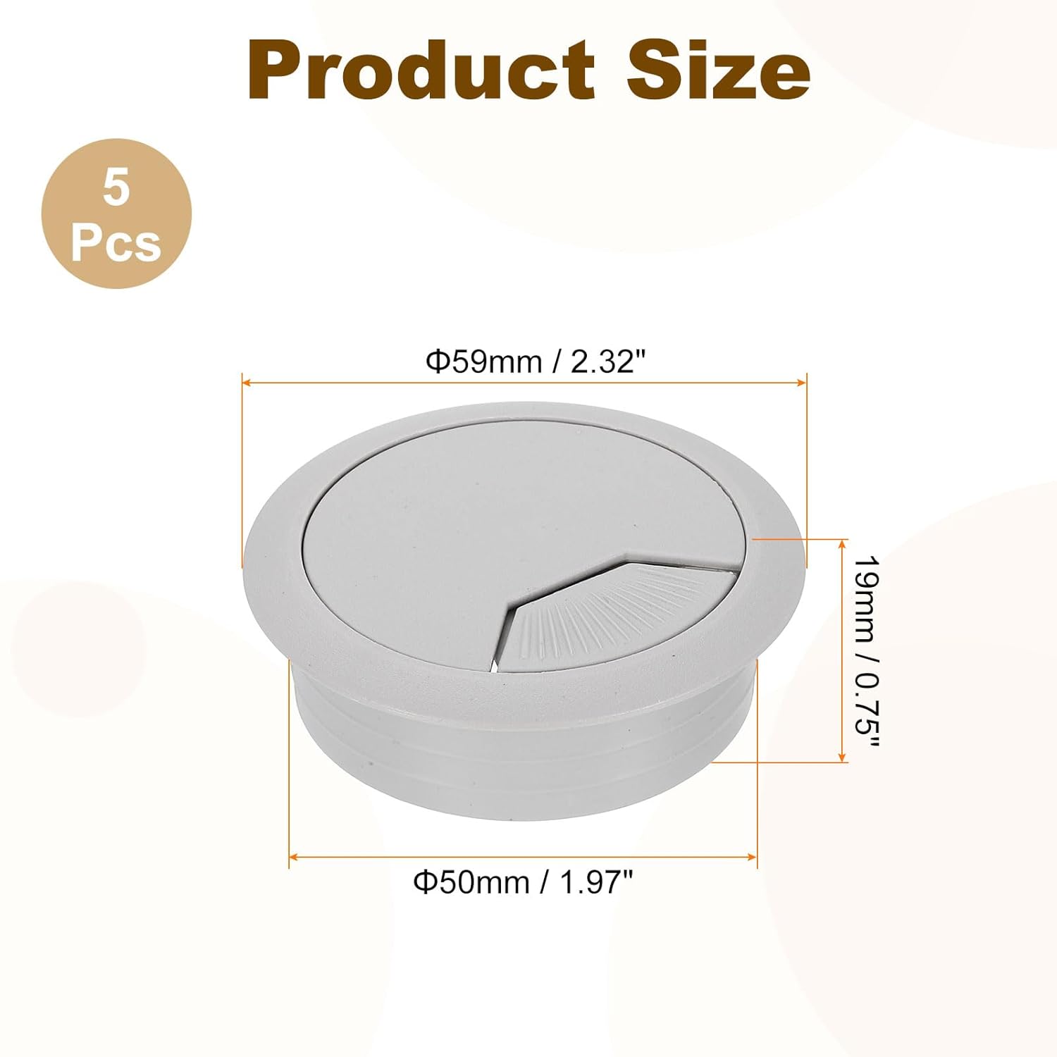 - [Plastic Grommet] - This product features a height of 19mm (0.75 inch), an upper diameter of 59mm (2.32 inch), and is designed to fit a hole diameter of 50mm (1.97 inch), and the package includes 5 pieces of desktop grommets