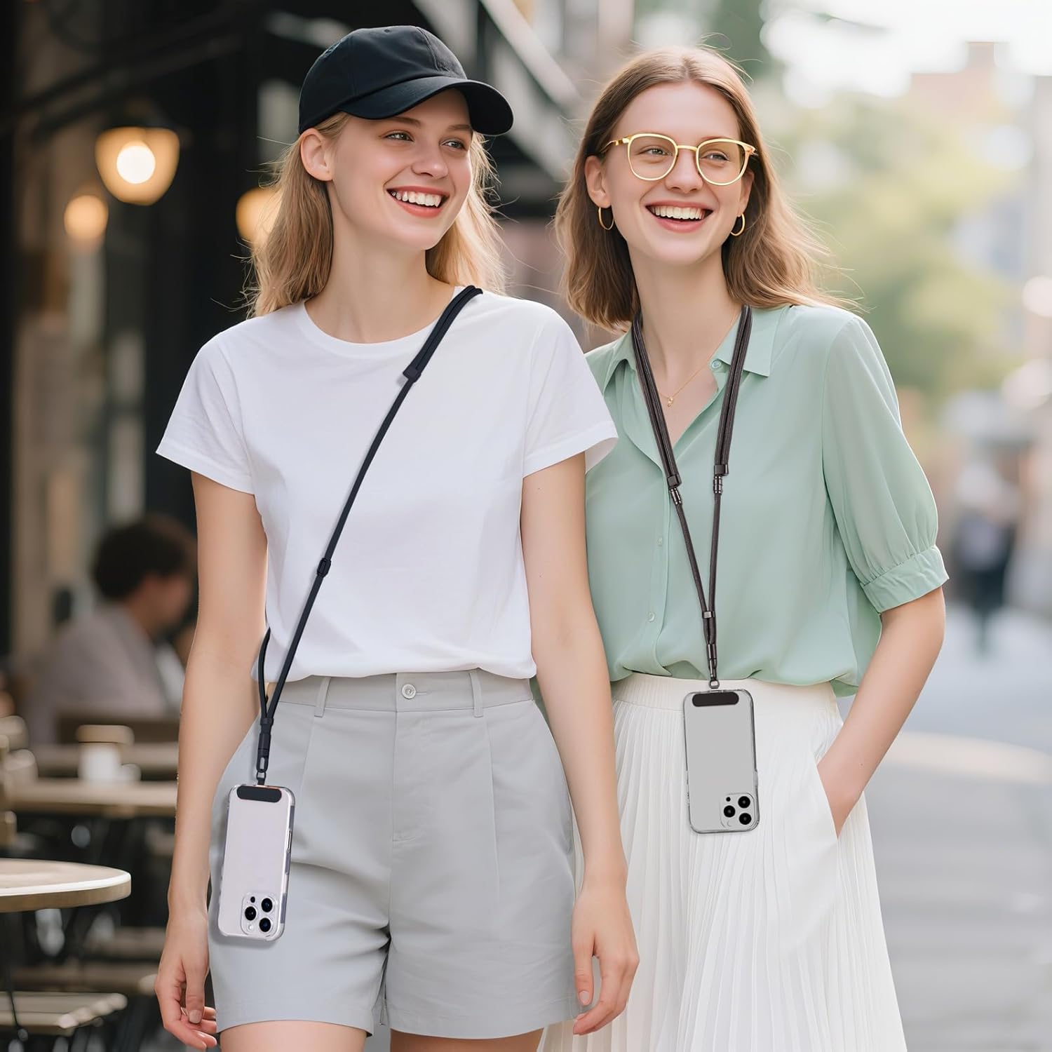 - Shugahn innovatively designed three-in-one phone lanyard can be bidirectionally adjusted in length between 15 and 31 inches with just a gentle pull. By easily turning the knob, it can transform into a Phone wrist lanyard in seconds. You can freely switch between wrist strap, crossbody, and neck-hanging styles. The adjustable tightness ensures that your phone remains always within easy reach whether you're strolling down the street or navigating through crowds.