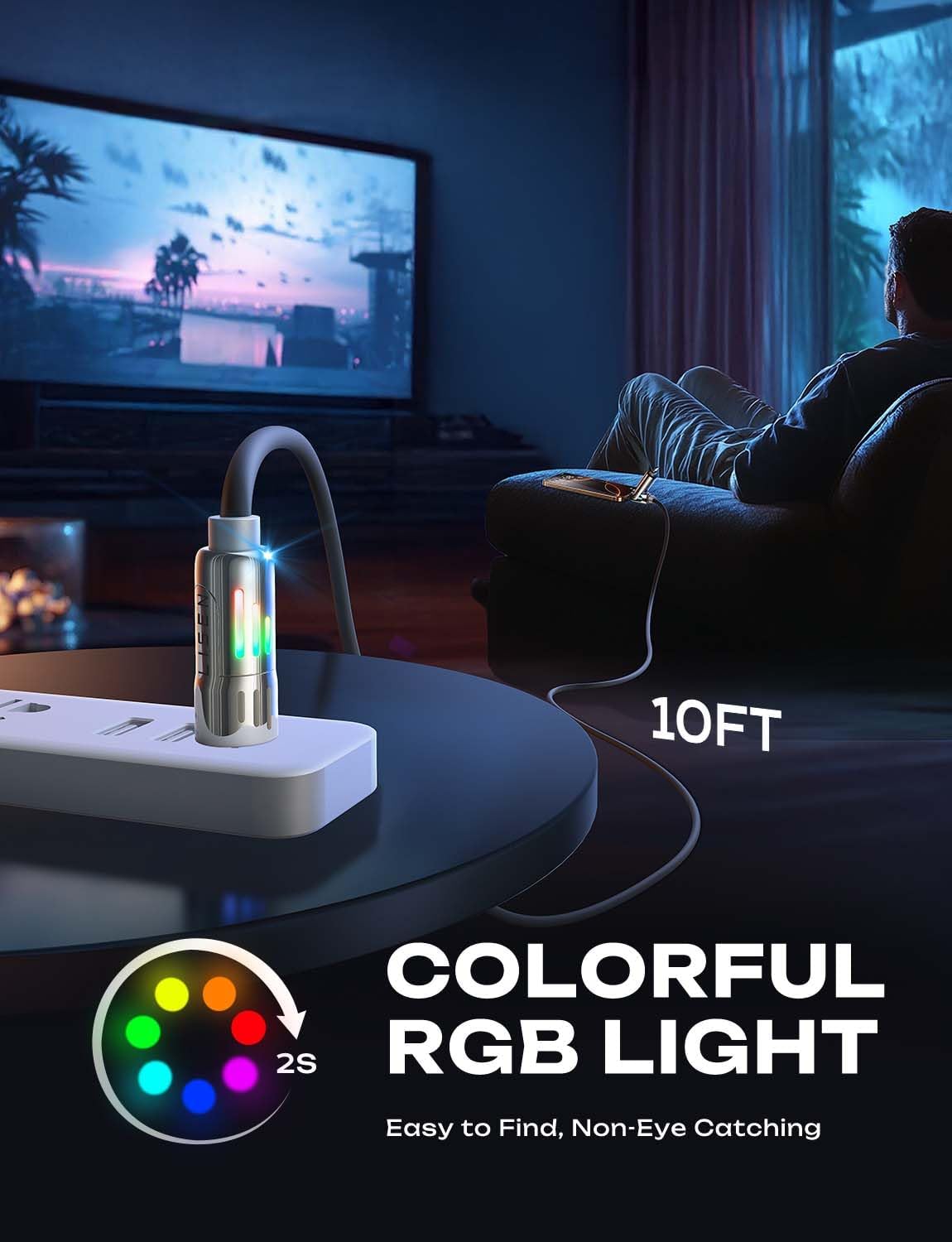 - [PD3.1 Emark Safe Chip & RGB light] The USB C to USB C Cable EMARK3.1 chip not only enables 240W fast charging but also maximizes device safety, ensuring 24-hour constant temperature charging. It automatically stops charging once the device is fully charged, preventing overcharging and battery damage. And RGB lights on both ports will keep changing colours when charging. It is a soft light, not flashing eyes, full of gaming atmosphere.